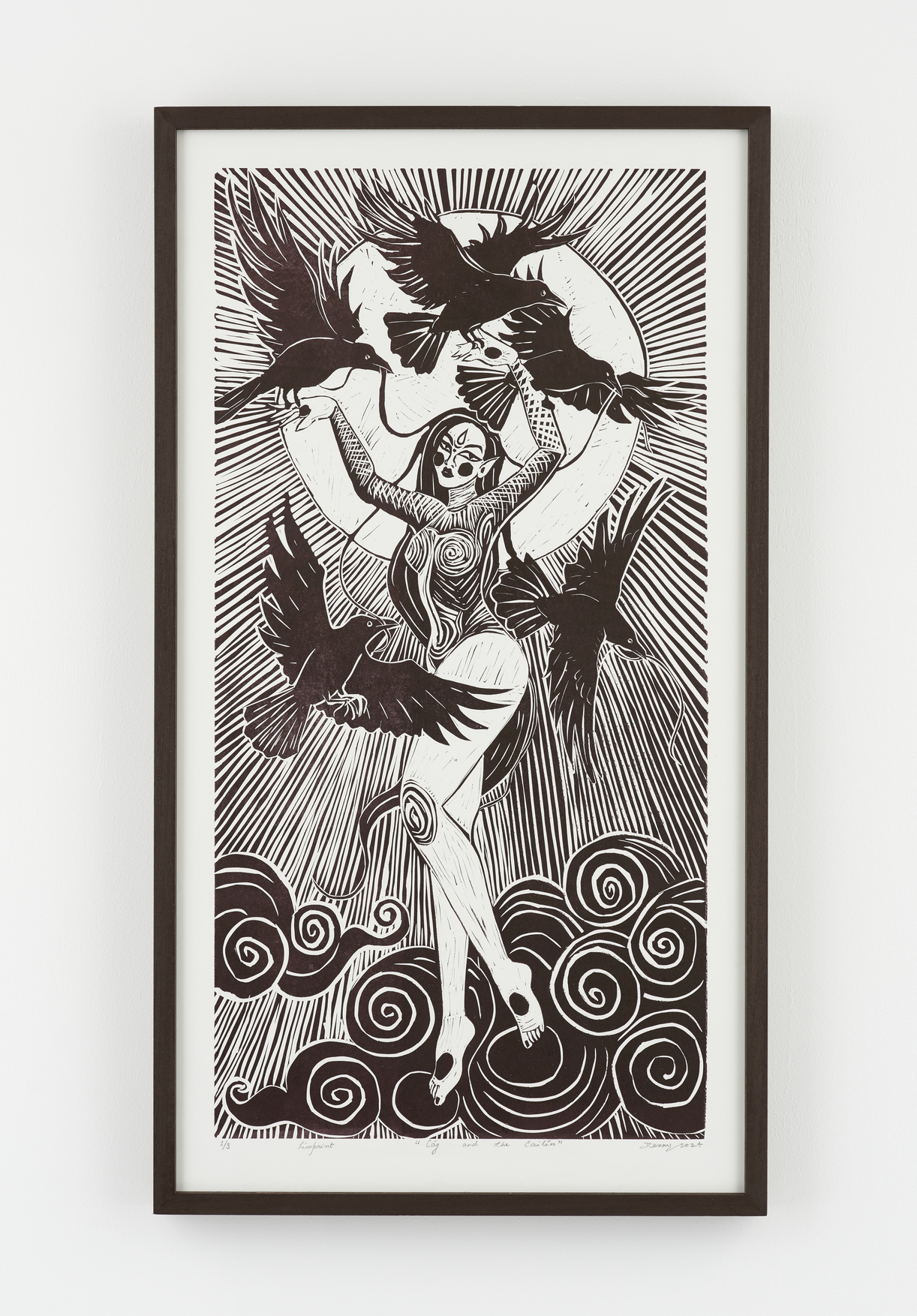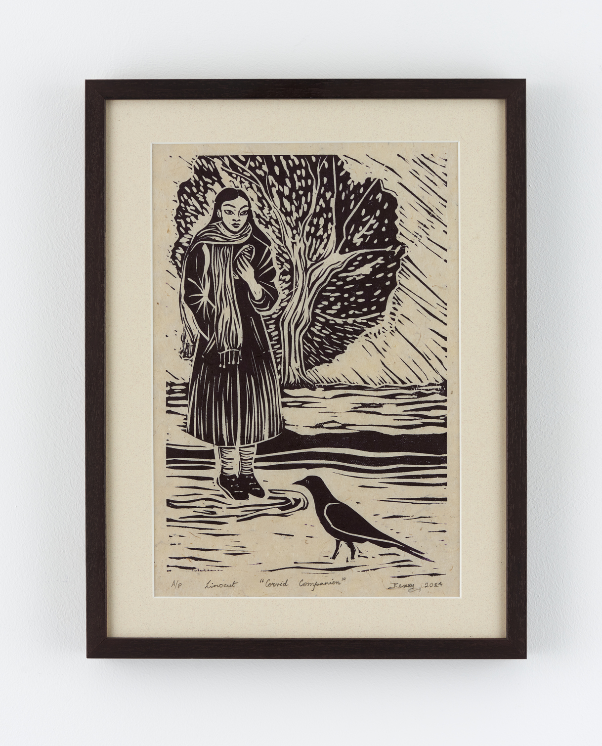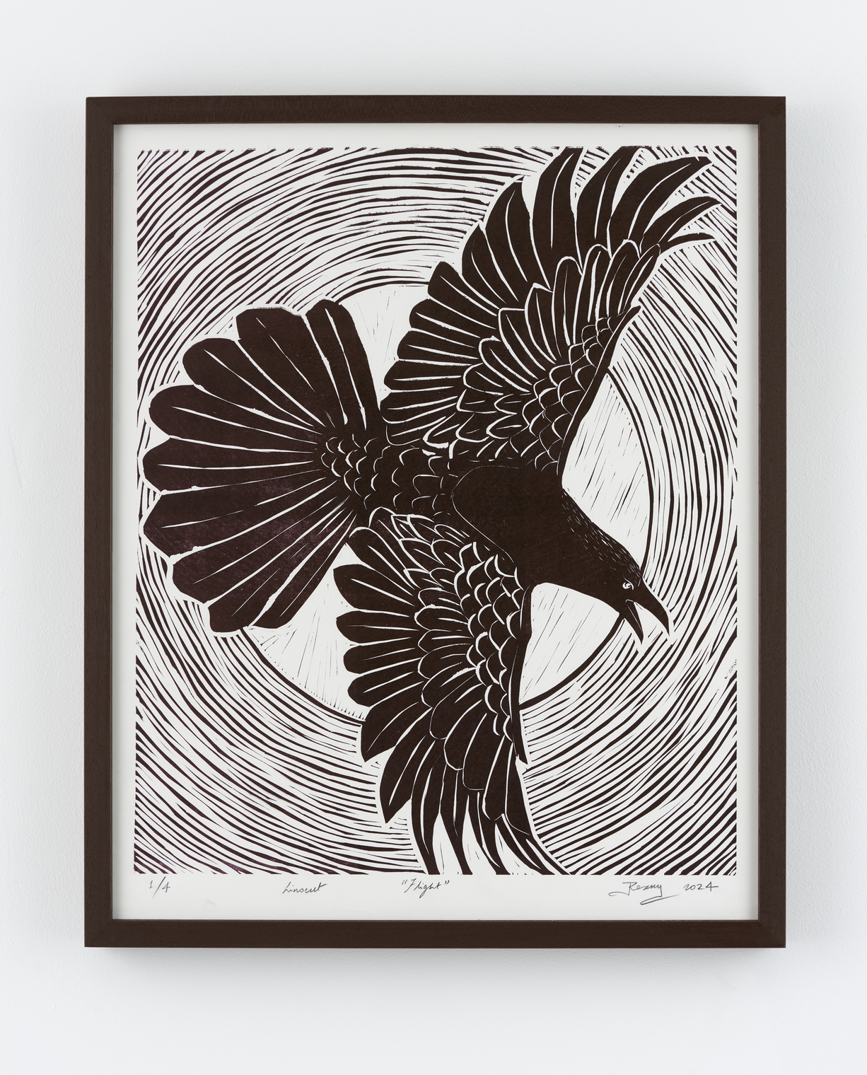 Ink on Japanese paper hand-printed linocut. Artist frame.