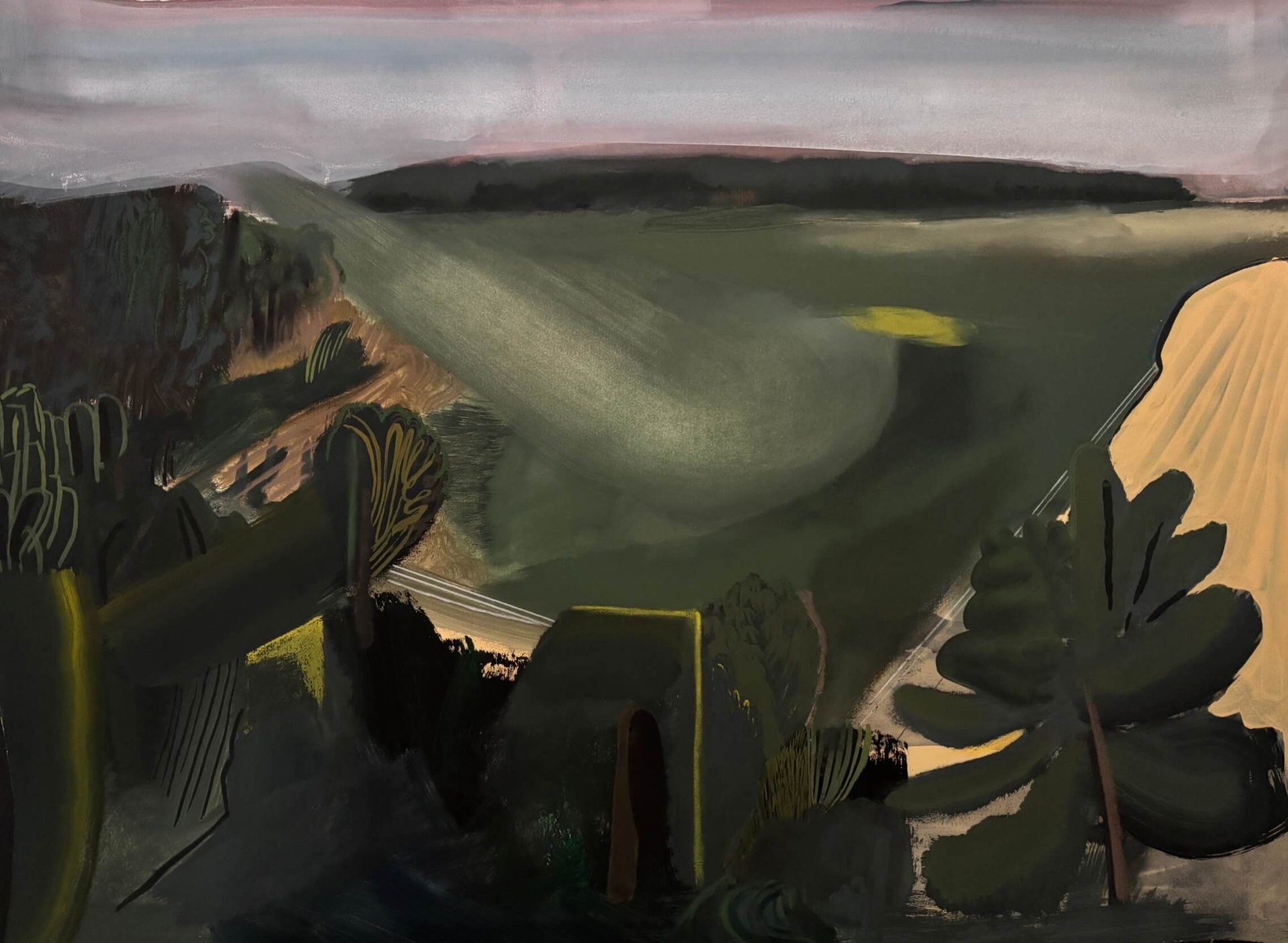 Gabriel Langlands paints directly from the landscapes that he knows: the woods, hills and agricultural expanses of south-east England, the mountains and waterways of the Scottish coast. These are sites that are at once rooted and familiar, yet perpetually in motion. Langlands’ processes mirror his subjects, with fleeting shifts in the season, light and weather rendered fluidly, somewhere between observation and abstraction. Broad brushstrokes sweep over bold simplified forms, playfully adjusting our sense of perspective. Langlands knows how to compress and expand space. Vast fields become dense blocks of colour, whilst a scumbled edge marks the shortening shadows of approaching Spring.