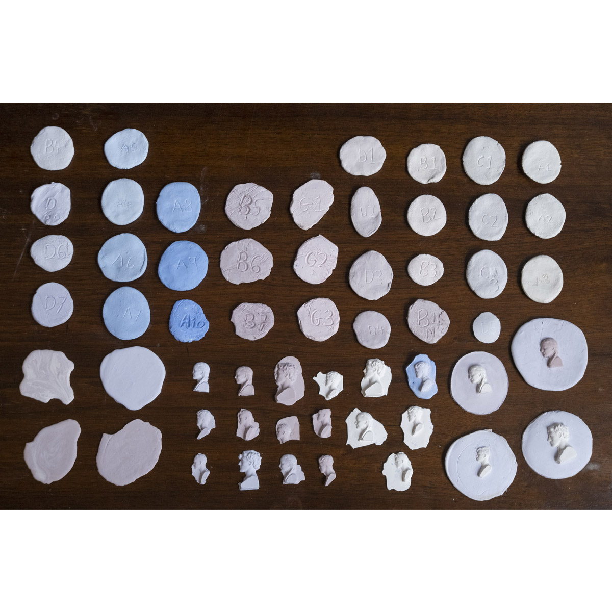 The exhibition’s title: Finding Ways In is multi-layered. Influenced by Collective member Sadie Cook’s initial exploration of finding ‘ways in’ to opera, it additionally captures the process of examining the archive and its artefacts as sources of creative possibilities. Traces of the past categorised under themes of people, performance and place led to the development of a variety of creative outputs inspired by artefacts. These include the correspondence of set designer Beni Montresor; the project: Potter to the Universe, prompted by a newspaper clipping of a Wedgwood Olivier Award from 1977; the cross hatch patterns in David Hockney’s designs for The Rake’s Progress, leading to two separate investigations; and an undated plan of planting for the Urn Garden, inspiring an exploration of Glyndebourne’s Dye Garden and a poetic collaboration.