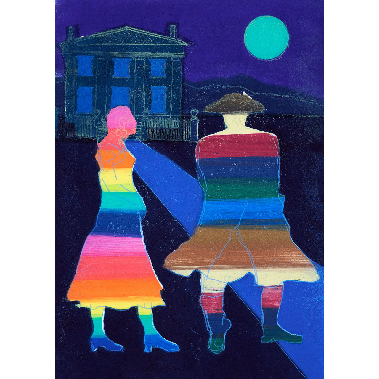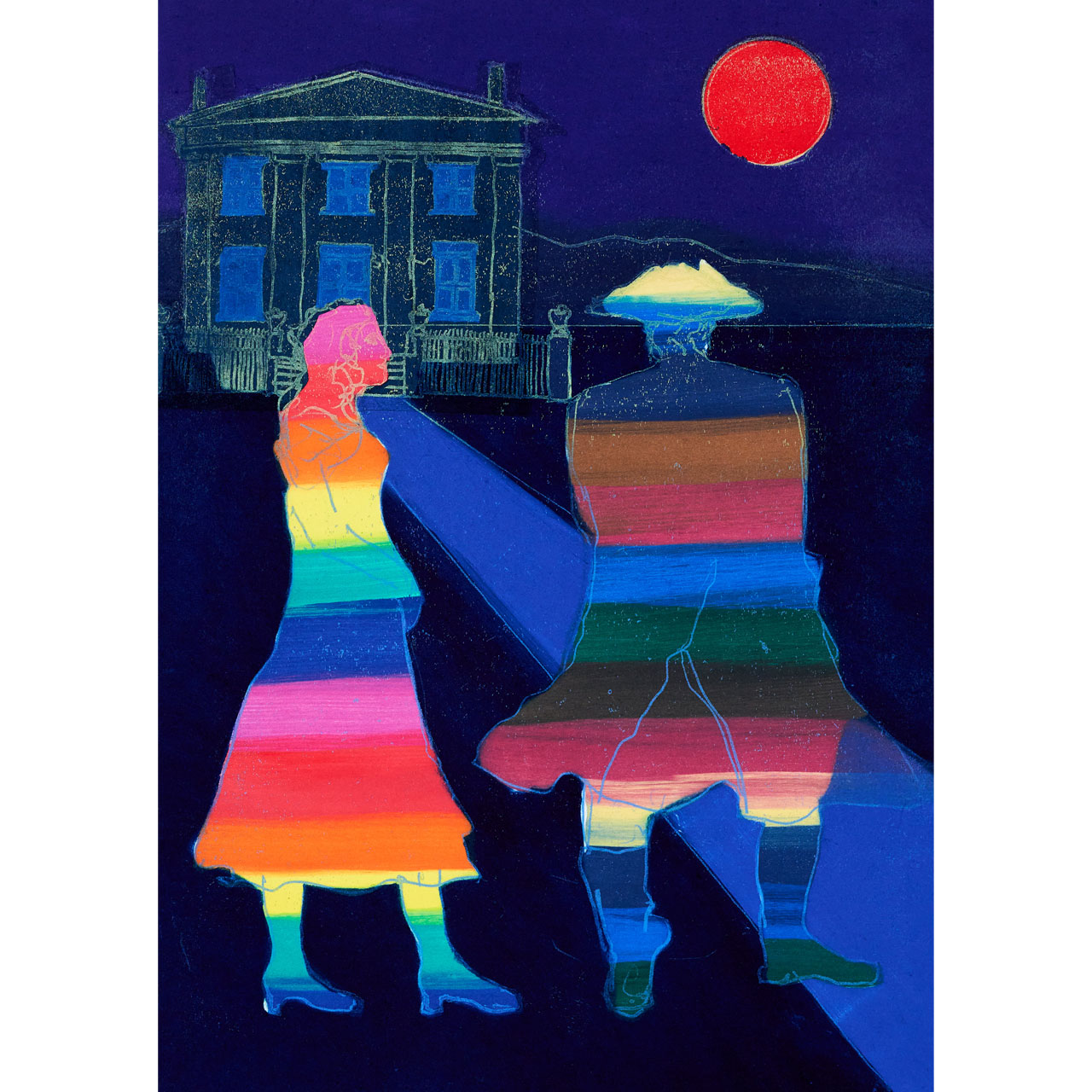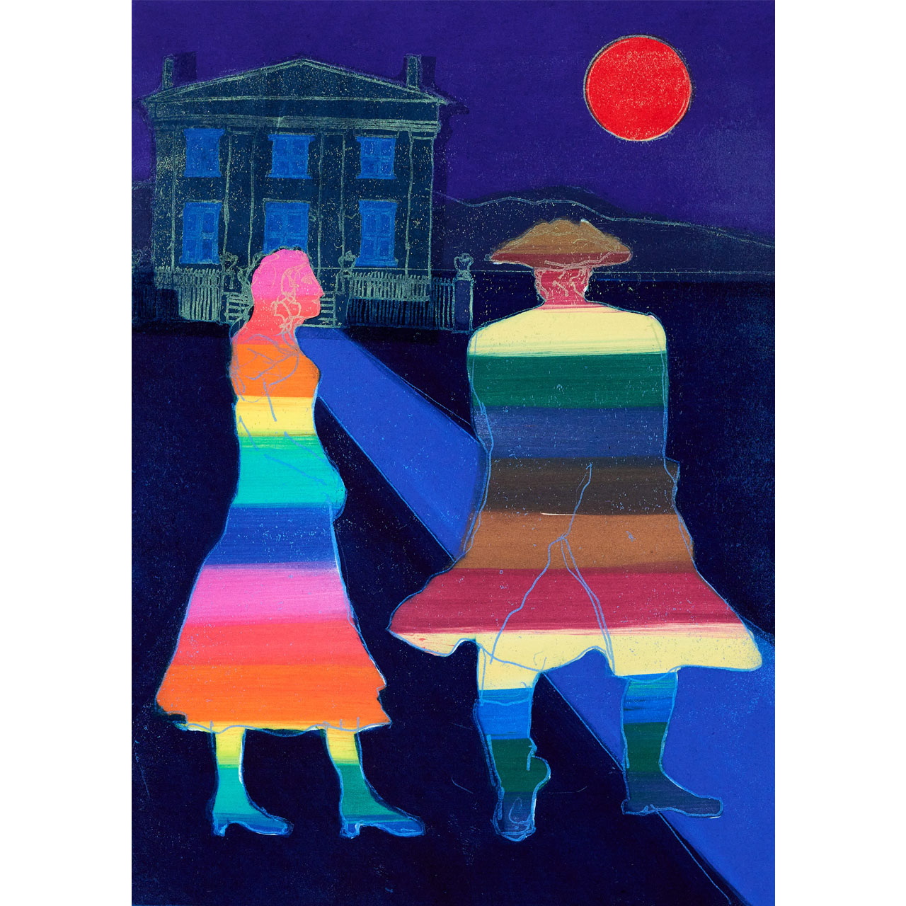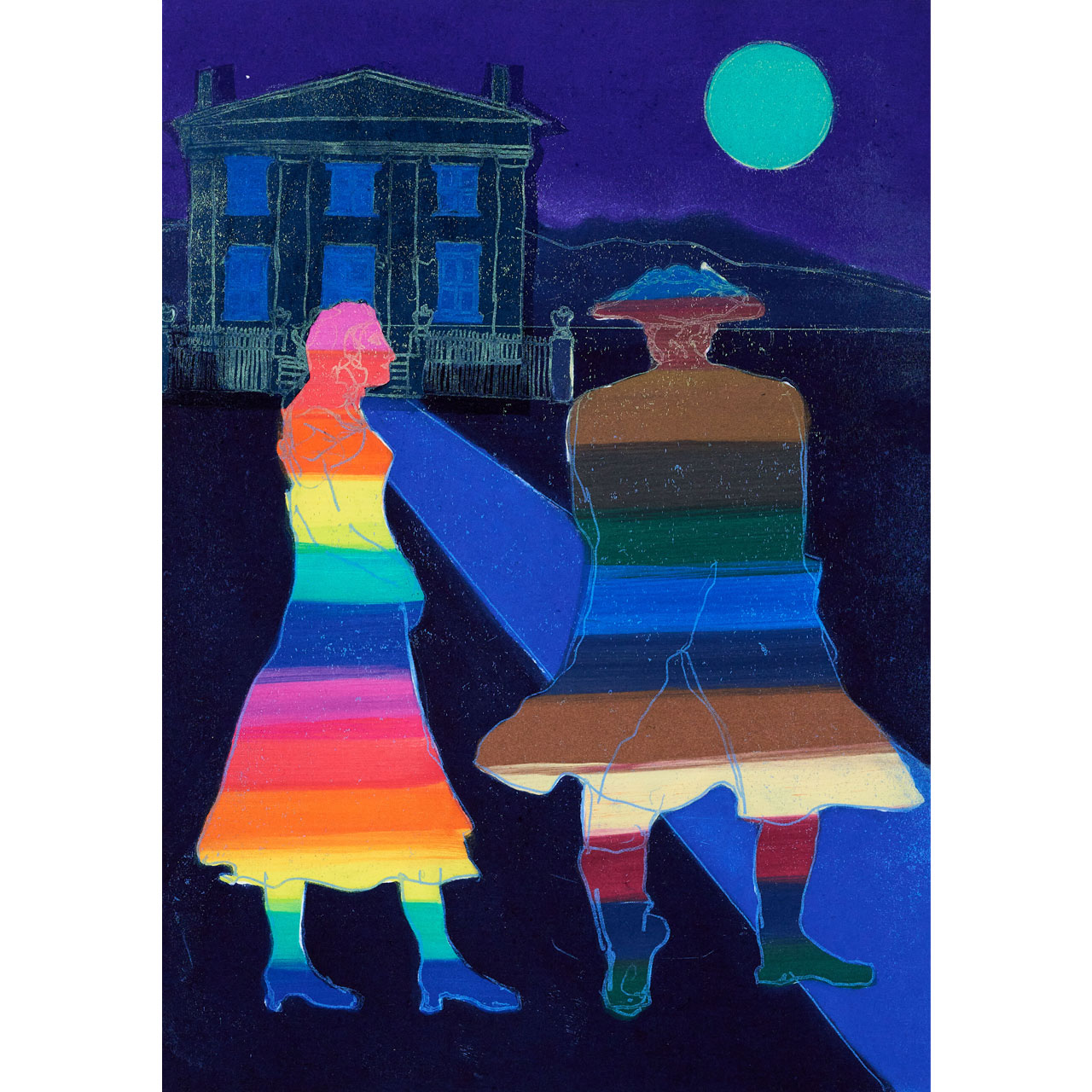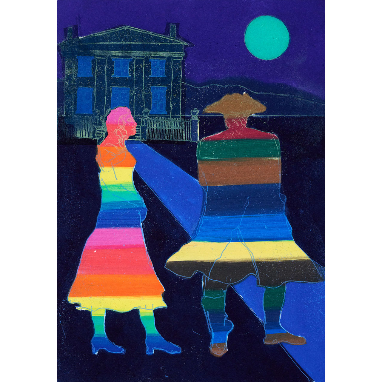 The colour differentiation seen in Anne Trulove’s dress and Tom Rakewell’s clothing is quite a blatant indication of their characters. Anne, the eternal optimist, never loses faith in the redemption of love. Meanwhile the Rake, by turning away and looking at her house, has replaced his love interest with more acquisitive intention.