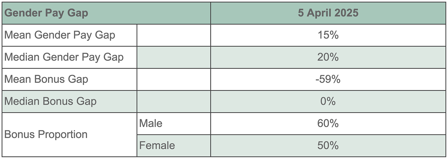 Our mean gender pay gap for 2024 is 15%, meaning that, on average, women earn 15% less per hour than men.