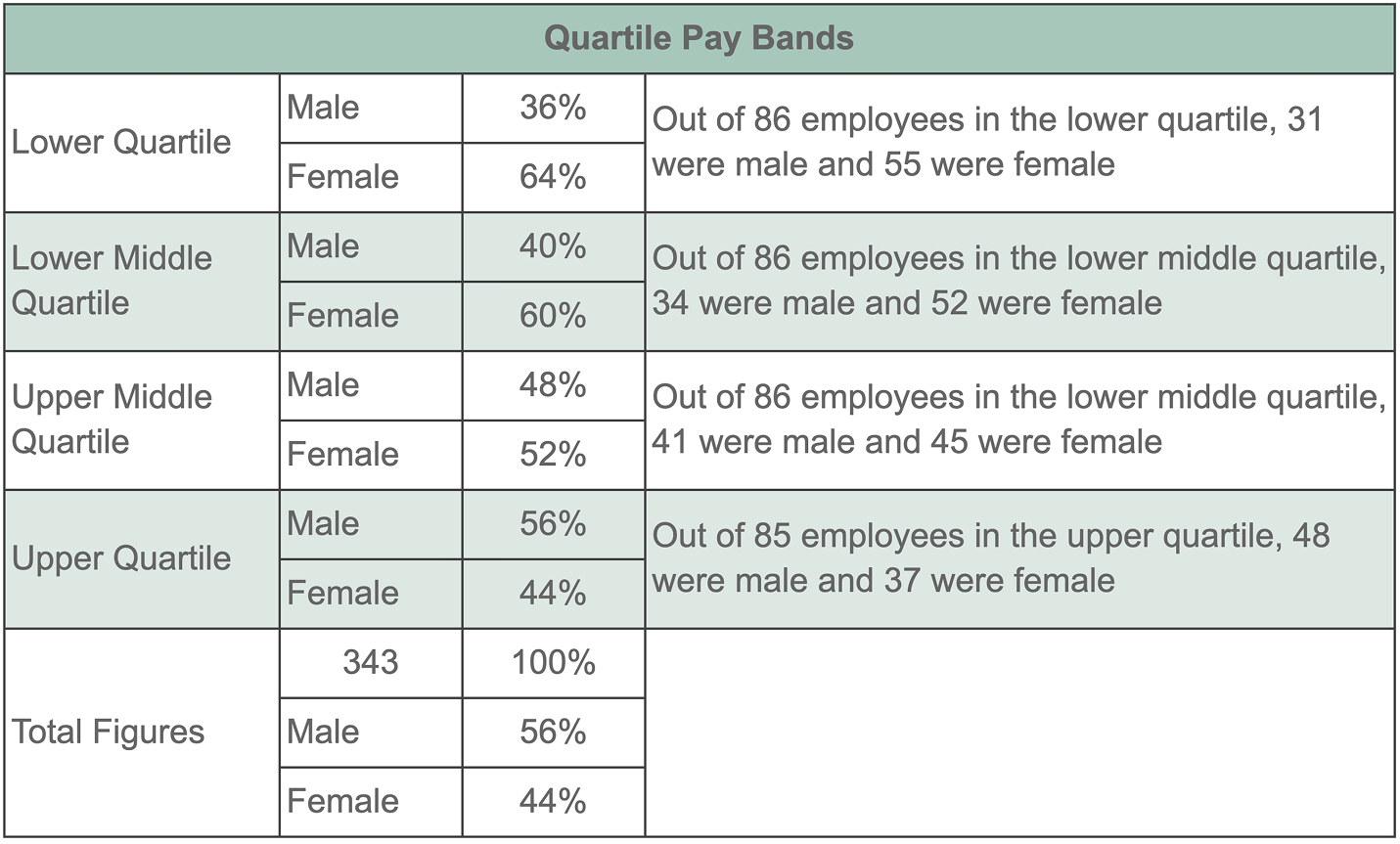 The Gender Pay Gap measures the difference between the average hourly earnings of men and women across an organisation, expressed as a percentage. A positive figure indicates that men earn more on average, while a negative figure indicates that women earn more.