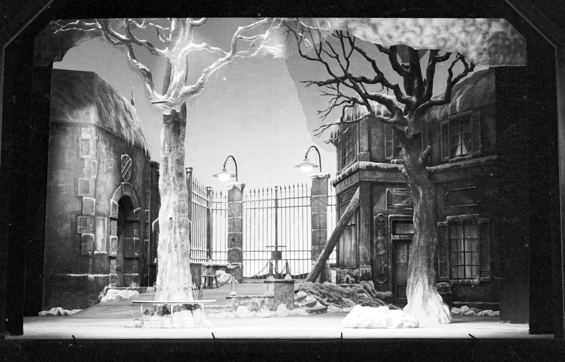 The photograph here depicts the wintry toll gate scene in Act III. The stark, chilly scene with piles of snow and frozen fountain would have been further enhanced with a gauze on which snow was projected in addition to torn newspaper drifting across the stage from the fly tower.