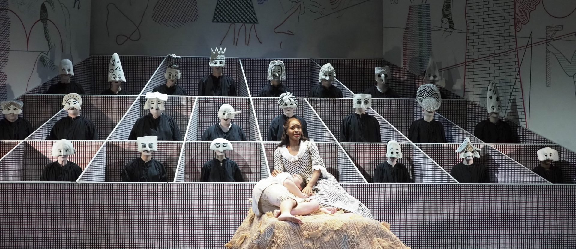 In Act III Scene III – Bedlam, Tom, condemned by Nick Shadow, wanders through the madhouse, imagining himself to be a mythical figure – Adonis, and his lover Venus (Anne). Holding him in her arms, Anne sings the lullaby ‘Gently, little boat’, which is one of the more touching arias in this opera. In this scene, the lovers are accompanied by the masked figures in grids. Those masks come in various shapes, some spiked and some domed, and do they only represent the madhouse residents or Tom’s mental world? In their singing, it is as if they are using their voices to satirise Tom’s self-inflicted misery, with a sense of wonder.
