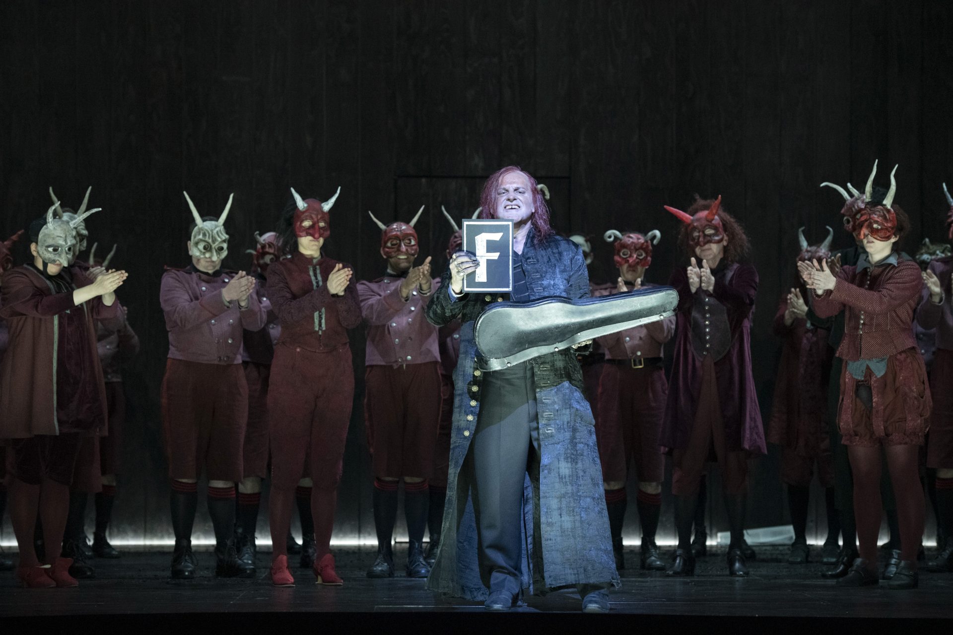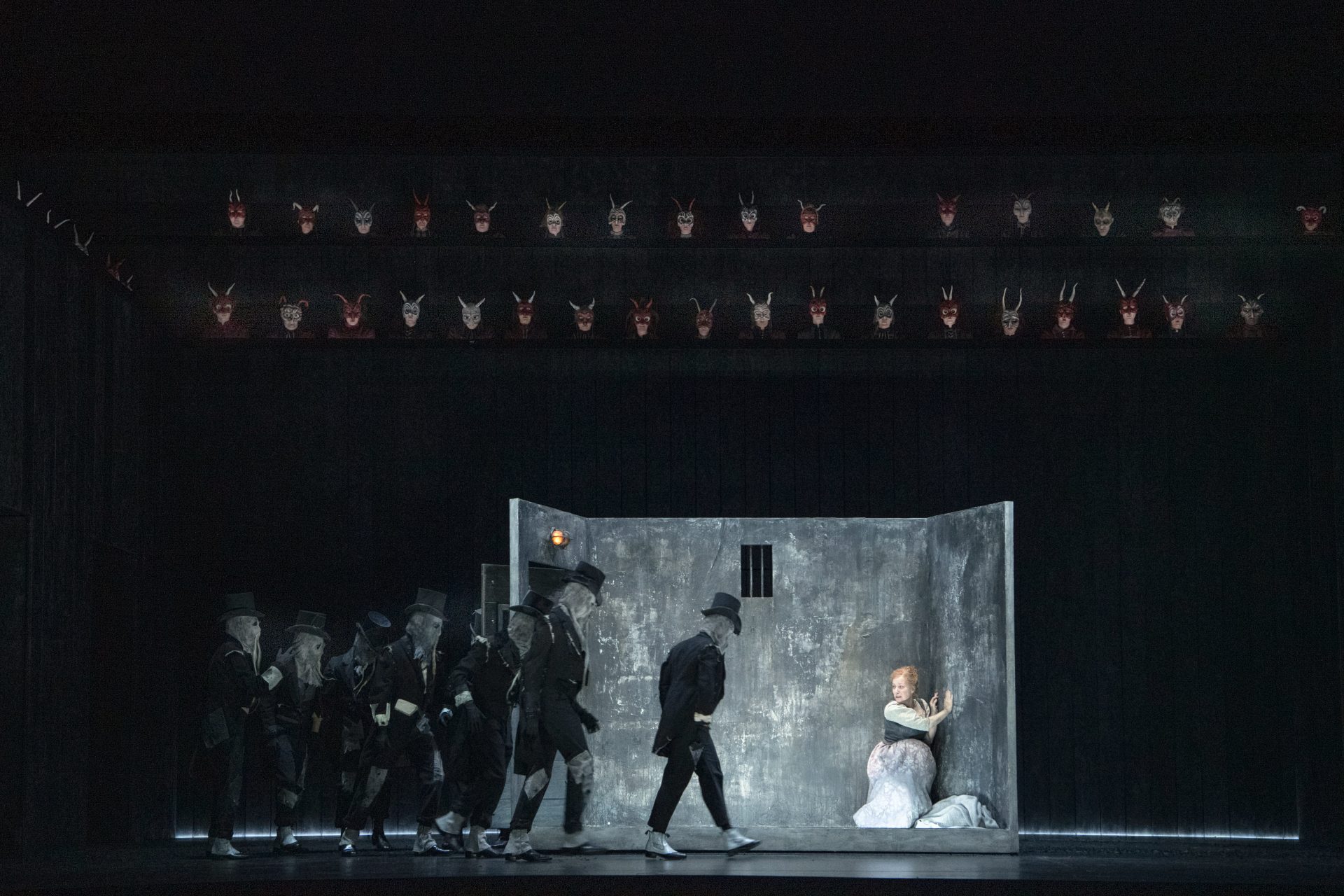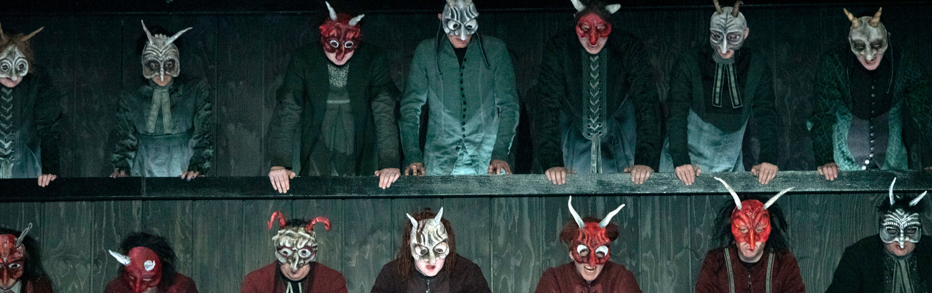 Berlioz’s La damnation de Faust was staged at Glyndebourne in 2019. The opera tells the story of Faust, who, misled by Méphistophélès’ promise to restore his youth and fulfil his wish, falls in love with the beautiful woman Marguerite, and is ultimately lured to hell by the demon Méphistophélès. The designer, Nicky Gillibrand, created masks of different colours, shapes and expressions, but without exception they were all masks with horns. With the Glyndebourne Chorus positioned high above the stage and dressed in ornate costumes and hideous masks, leer not only over the performers, but the audience too. The uplighting makes them appear even more ghastly and terrifying. Meanwhile, a group of dancers, dressed in yellow and black tights and masks, swarm out of the doors on the stage and dance around Faust, adding a touch of horror and grotesqueness to the whole opera. The chorus with devil masks seems to be listening with Faust to the “benefits” of the Méphistophélès, and as if they are urging Faust to follow the devil’s call, which brings the horror atmosphere to a climax.