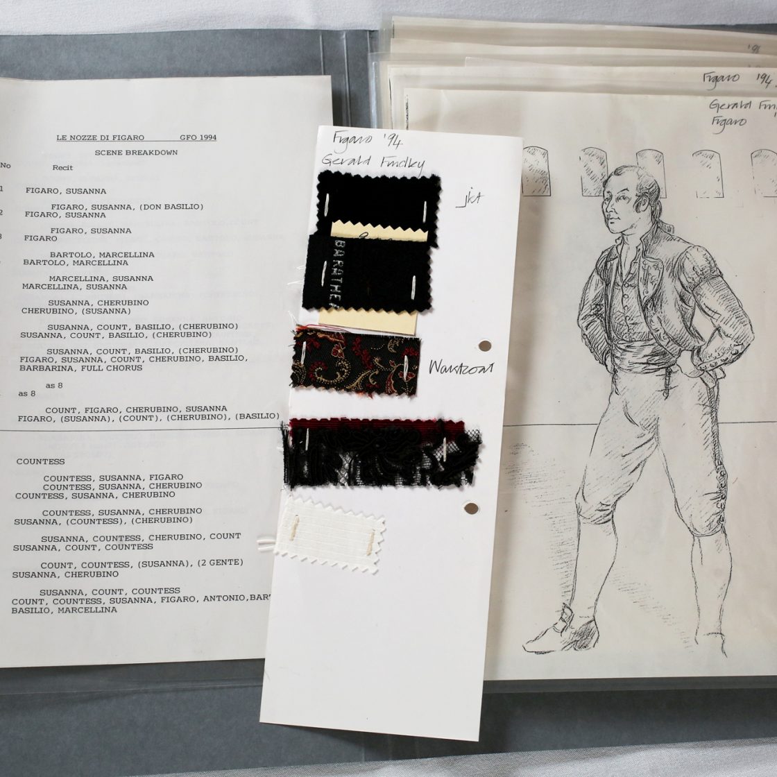 A costume bible from Stephen Medcalf’s 1994 Le nozze di Figaro – the first production to be staged in Glyndebourne’s new theatre, with beautiful eighteenth-century designs by John Gunter. It’s something we create for every new Glyndebourne production, and includes not only all the costume designs but also swatches of fabrics, sketches, supplier lists and measurement charts for the singers.