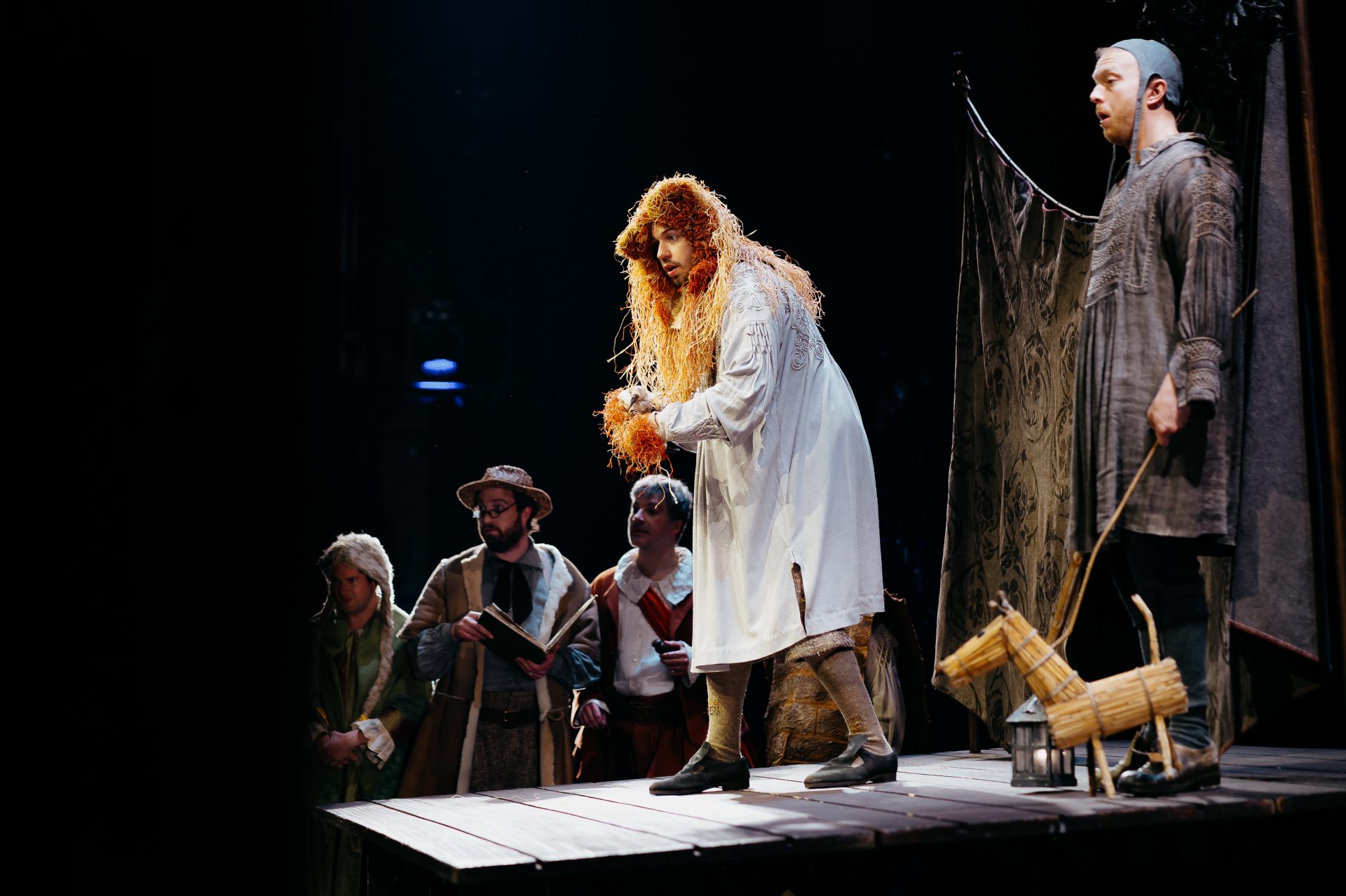 James Way (Flute), Michael Ronan (Quince), Joshua Bloom (Bottom), Jamie Woollard (Snug), and Alex Otterburn (Starveling) on stage