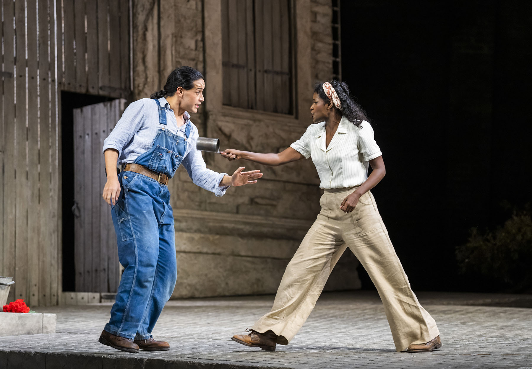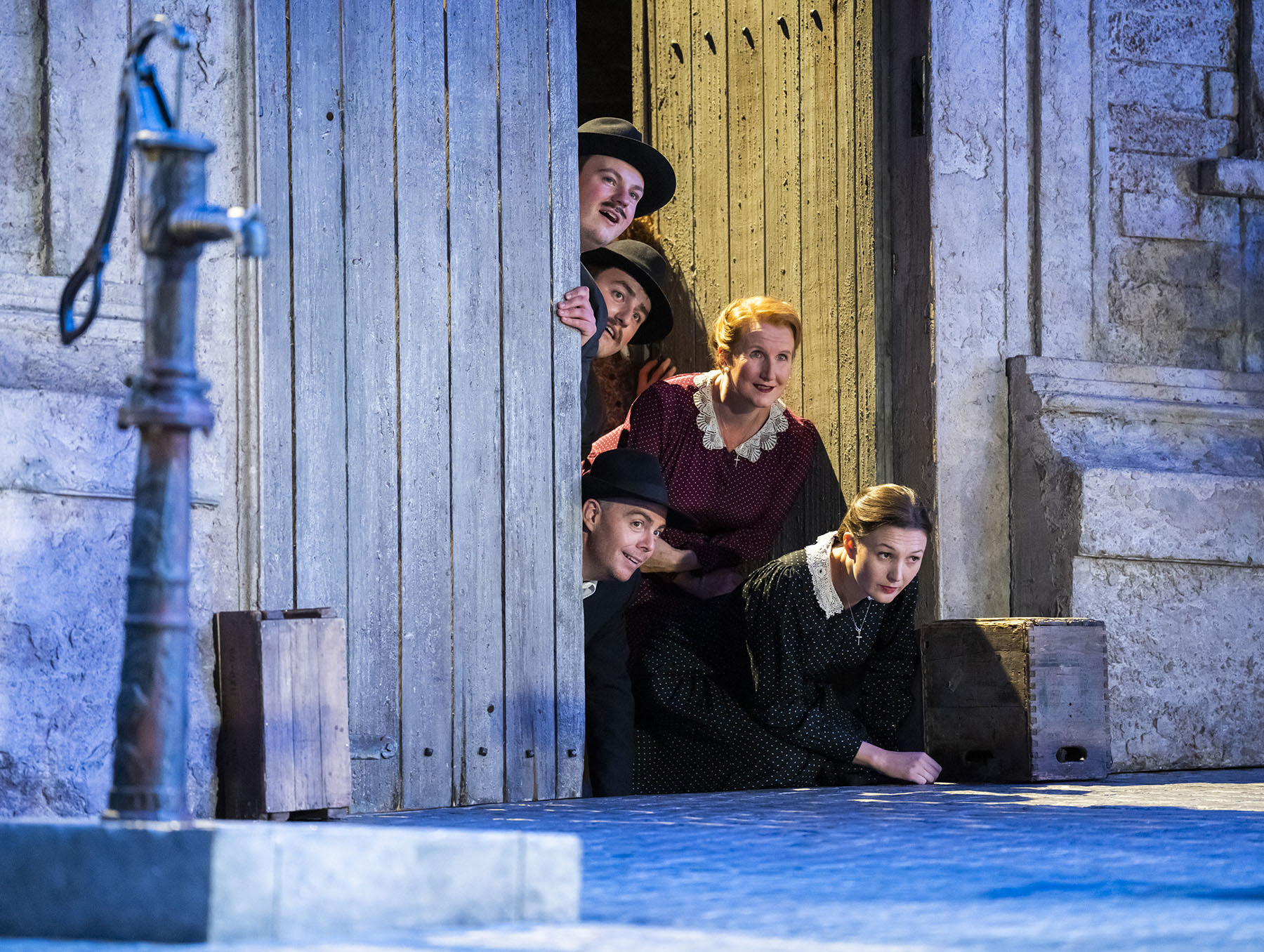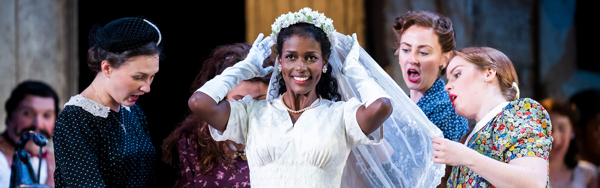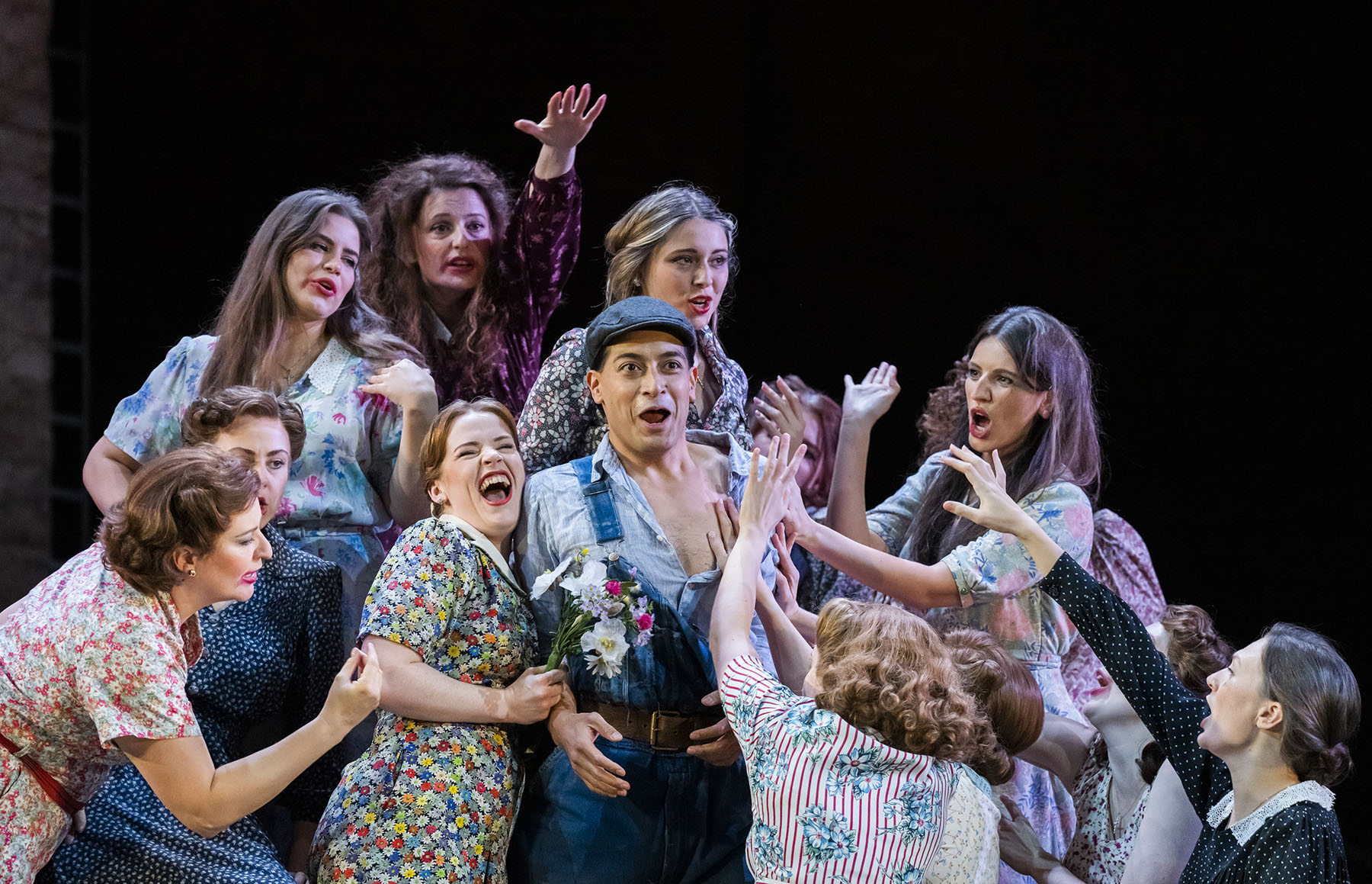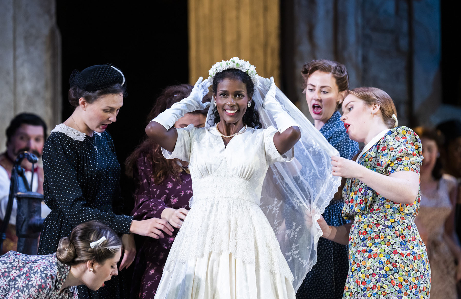 Adina (Mariam Battistelli), Giannetta (Ffion Edwards) and members of the Glyndebourne Chorus