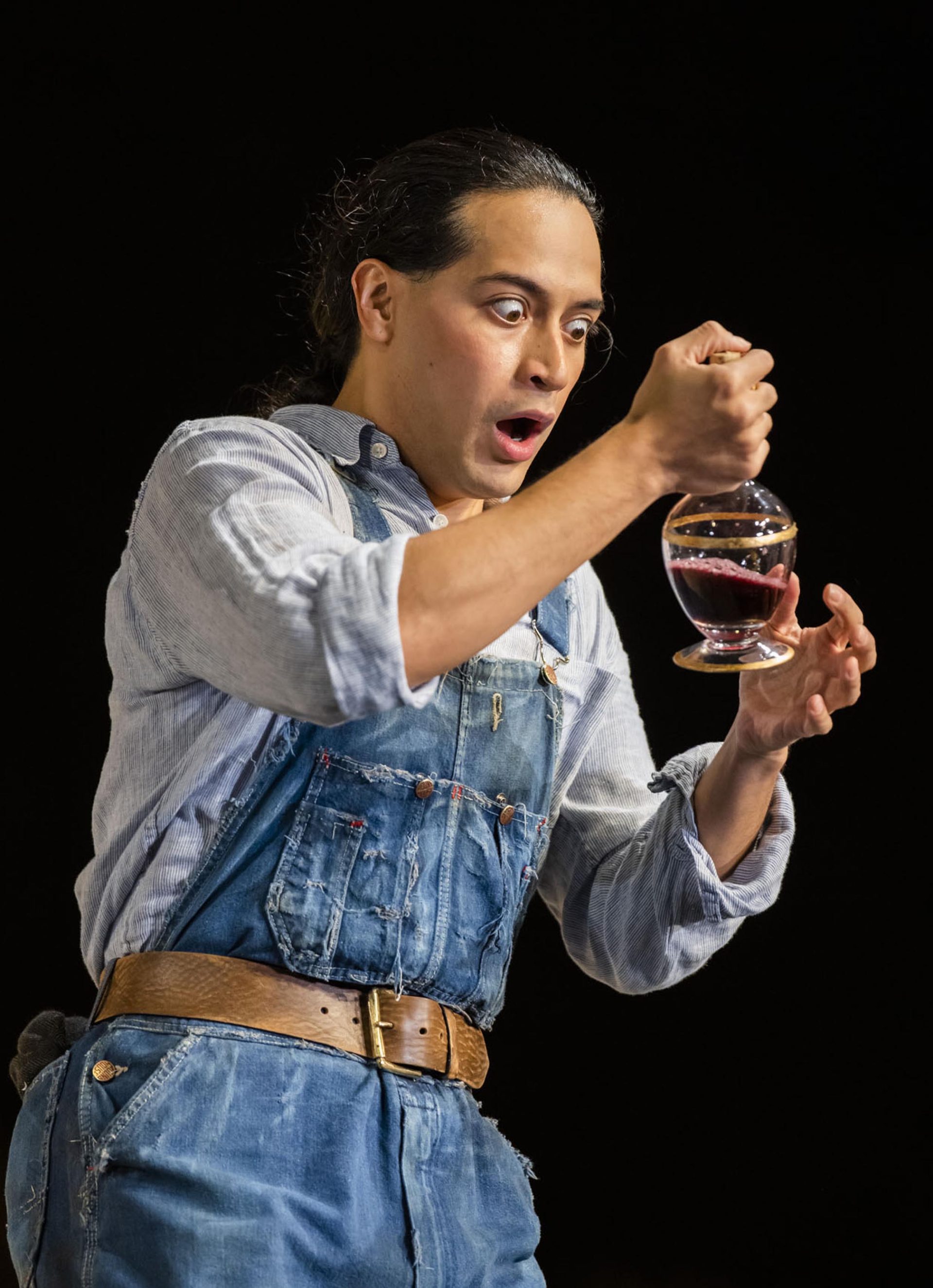 Dulcamara’s assistant (Maxime Nourissat) and Nemorino (Filipe Manu)