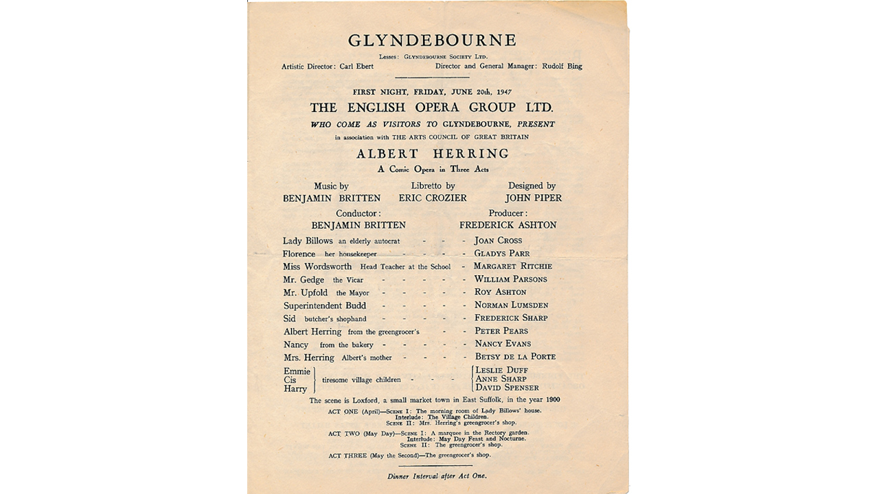 Benjamin Britten’s Albert Herring had its world premiere at Glyndebourne in 1947 in a production by the English Opera Group.