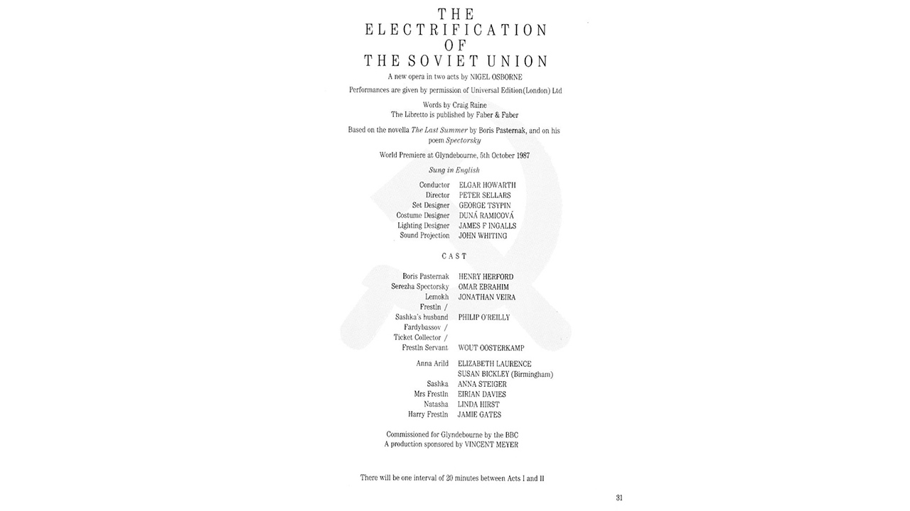 Commissioned for Glyndebourne by the BBC, The Electrification of the Soviet Union premiered as part of the 1987 Glyndebourne Tour.