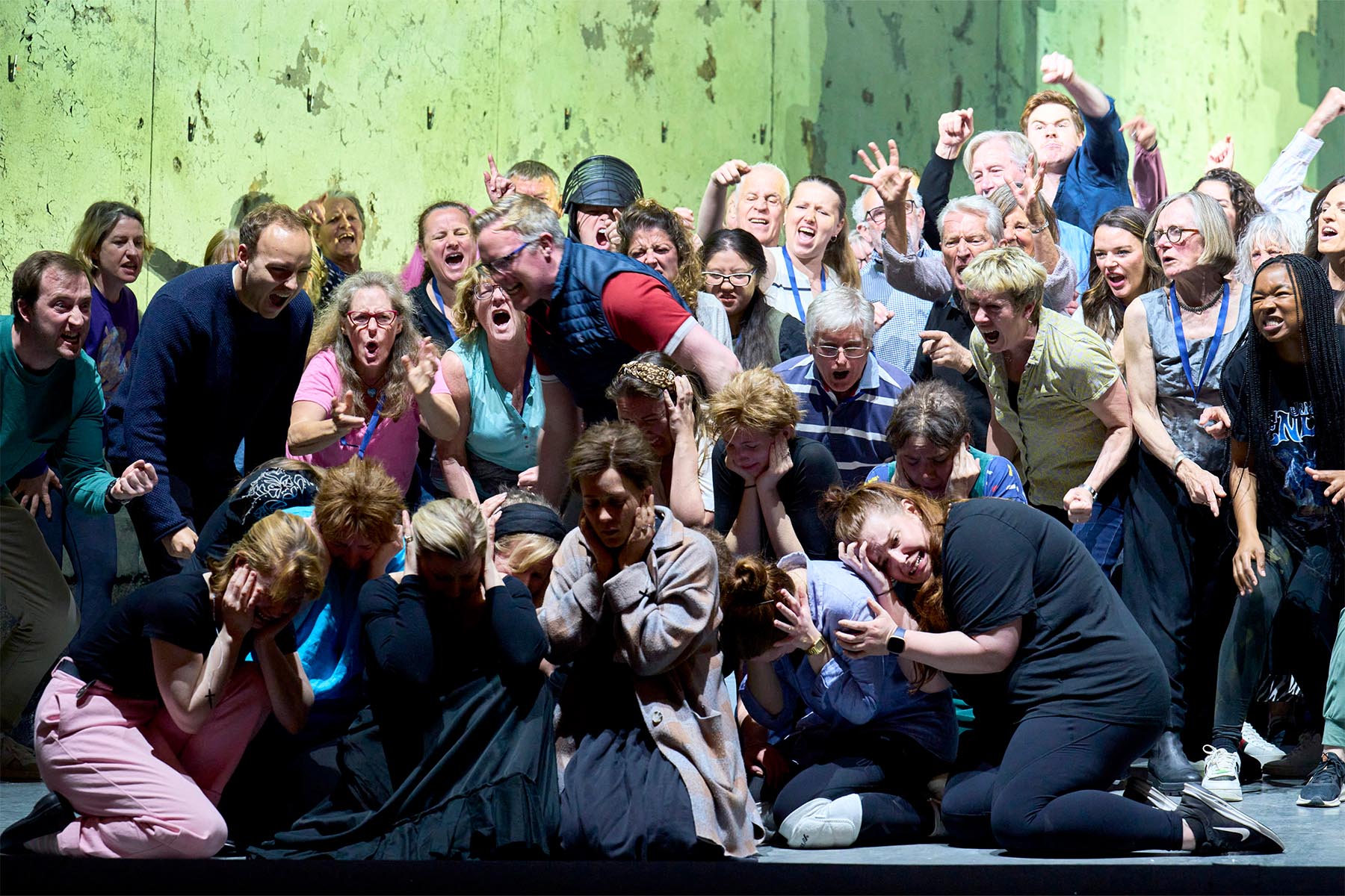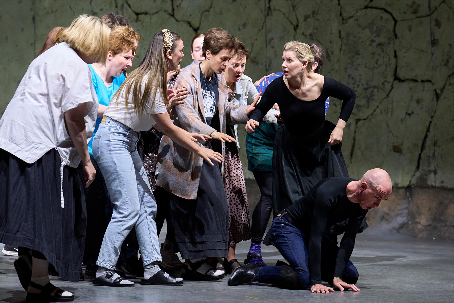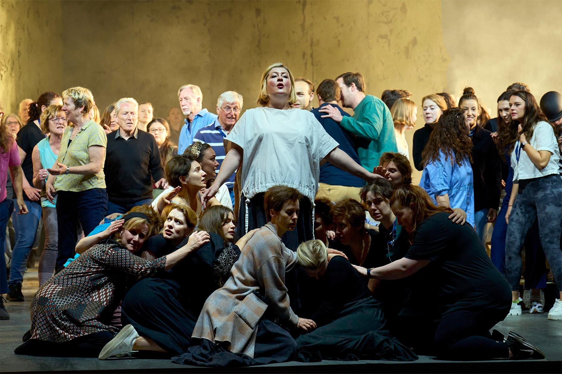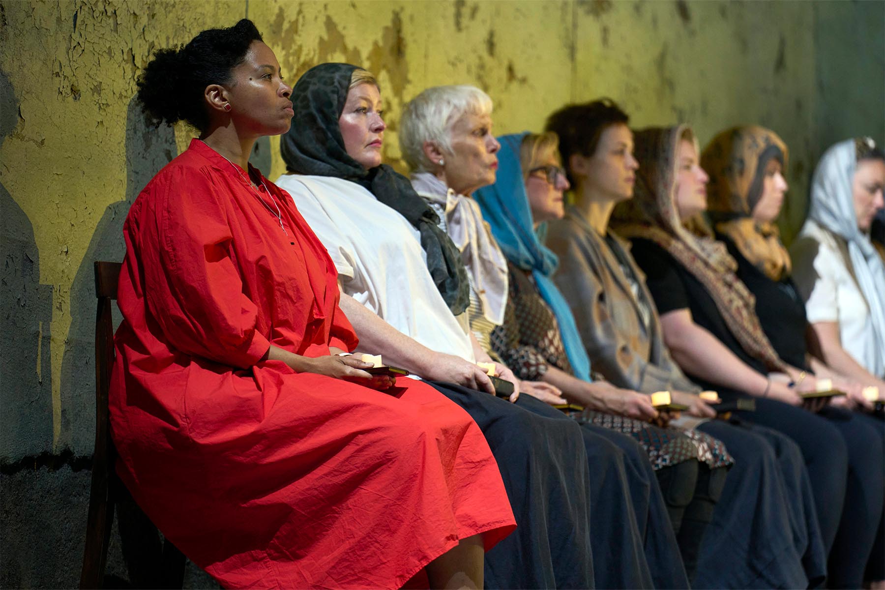 Golda Schultz (Madame Lidoine, new Prioress), Karen Cargill (Mother Marie), Fiona Kimm (Mother Jeanne) and Florie Valiquette (Soeur Constance) with members of the Glyndebourne Chorus