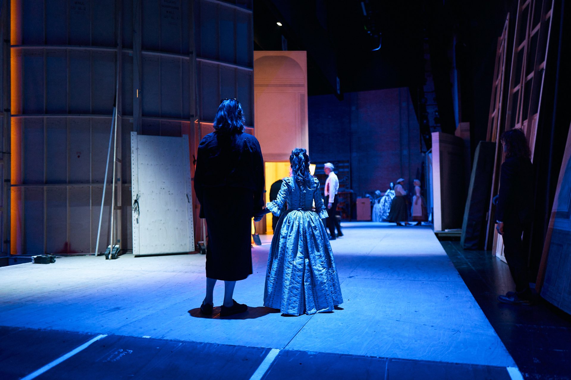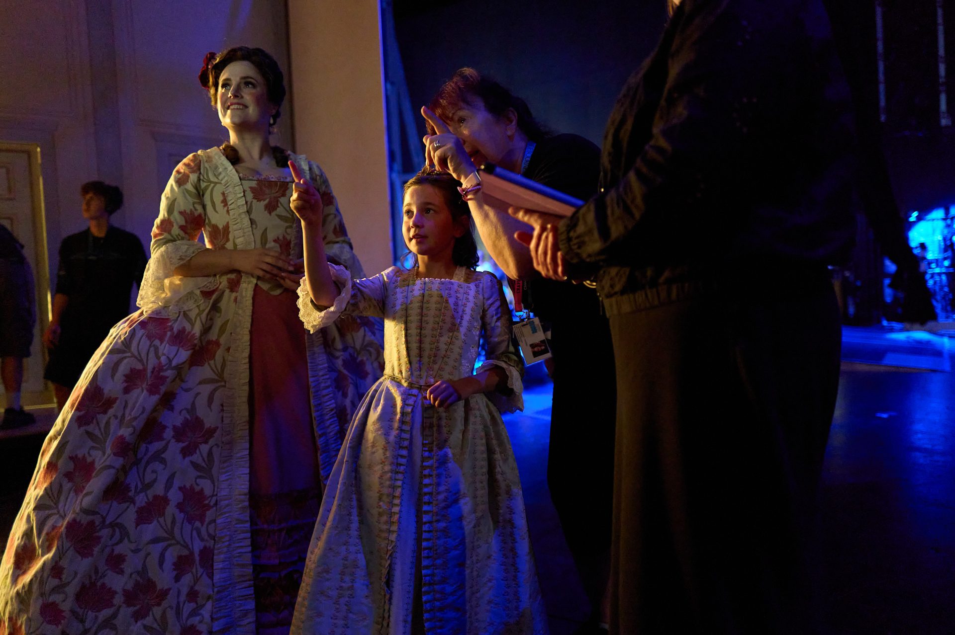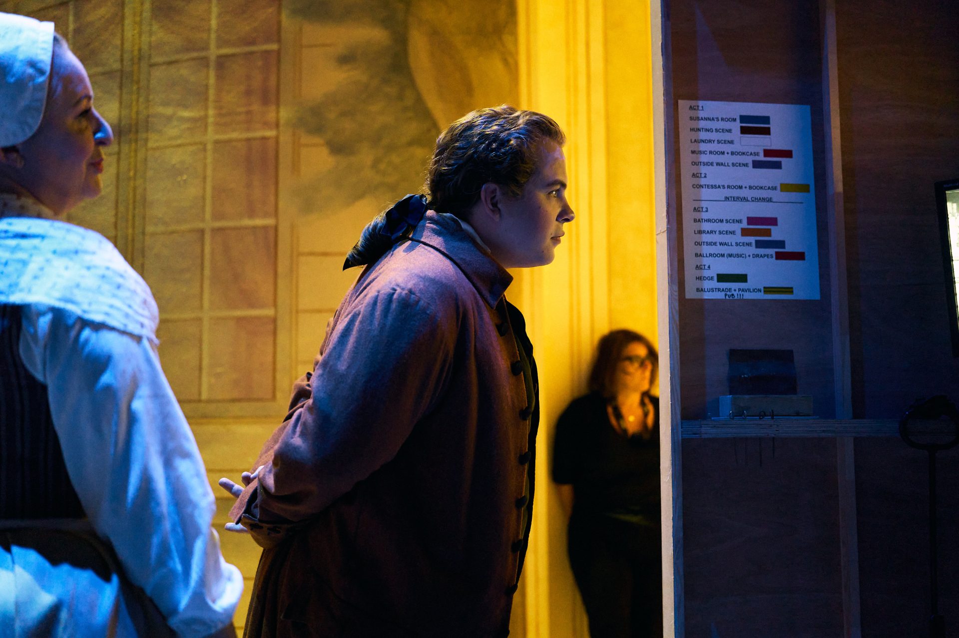 Adèle Charvet (Cherubino) and Stage Management backstage