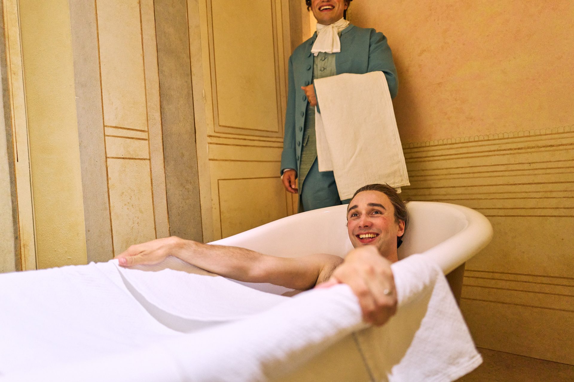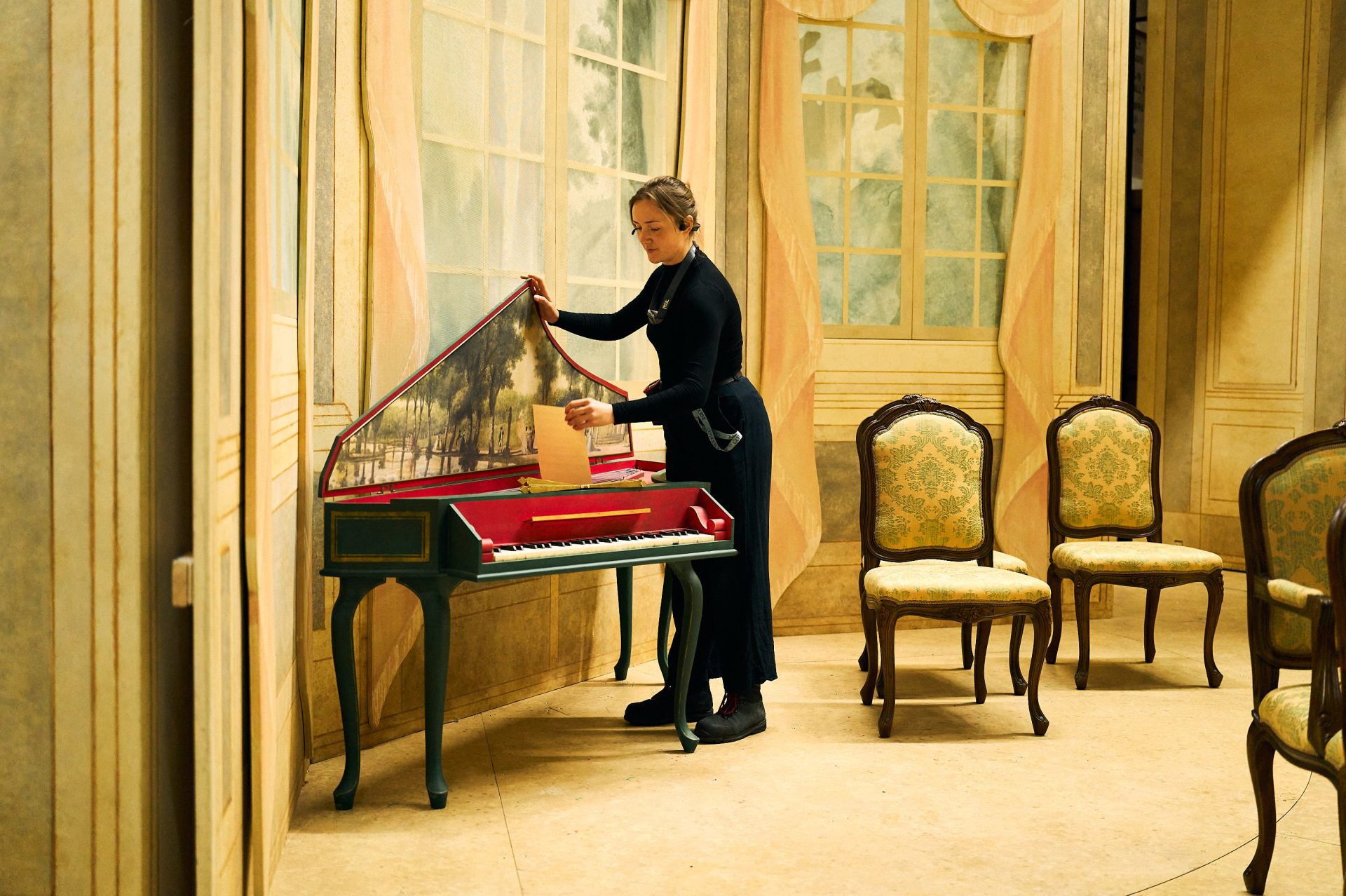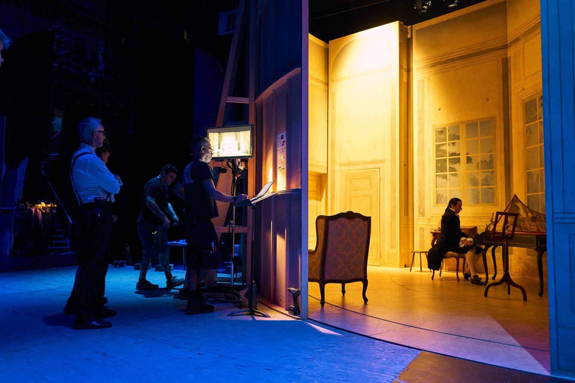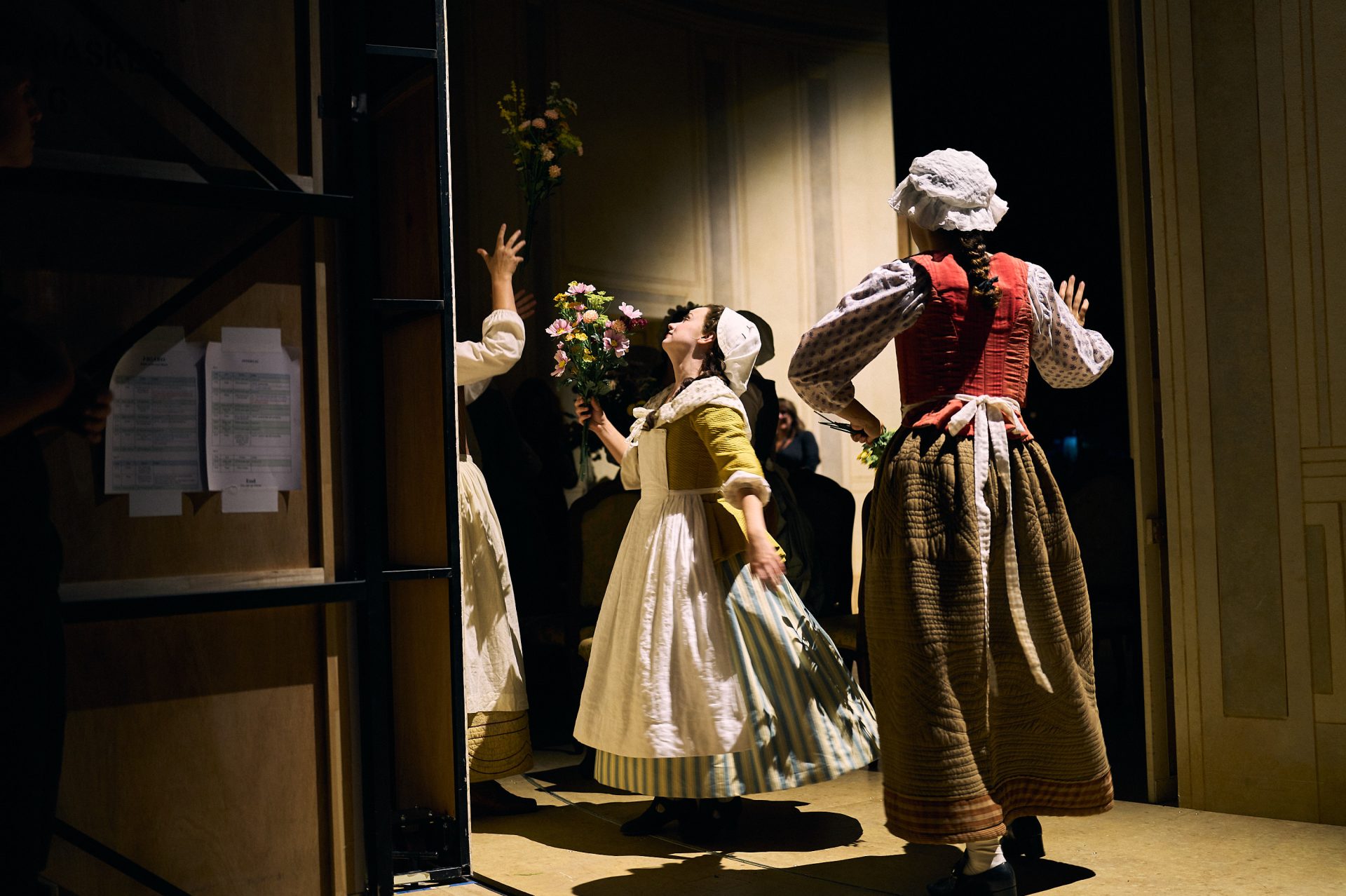 Adèle Charvet (Cherubino) and Stage Management backstage