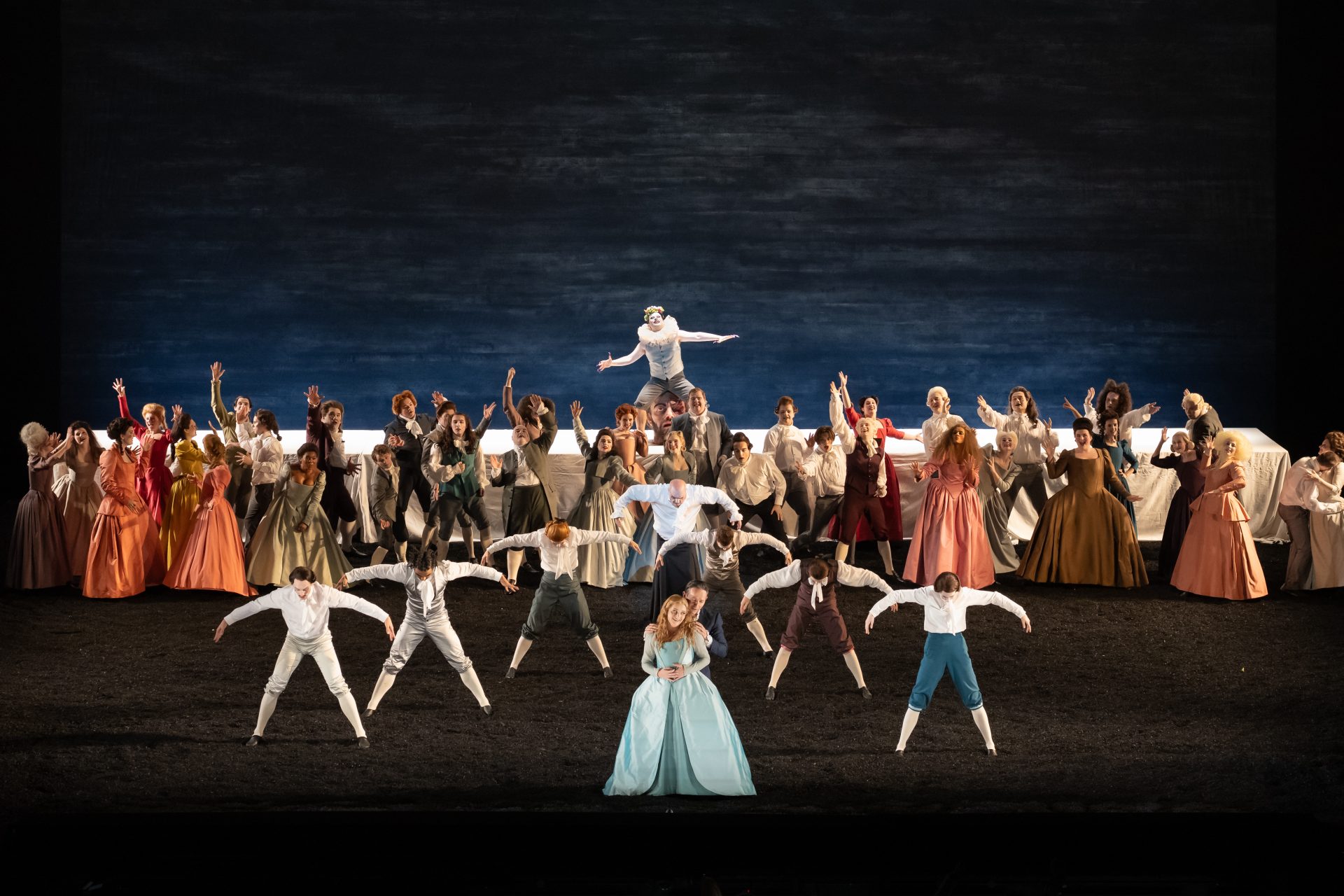 Back: Merab (Sarah Brady), Jonathan (Linard Vrielink), Saul (Christopher Purves) and Michal (Soraya Mafi). Front: Dancers and members of the Glyndebourne Chorus