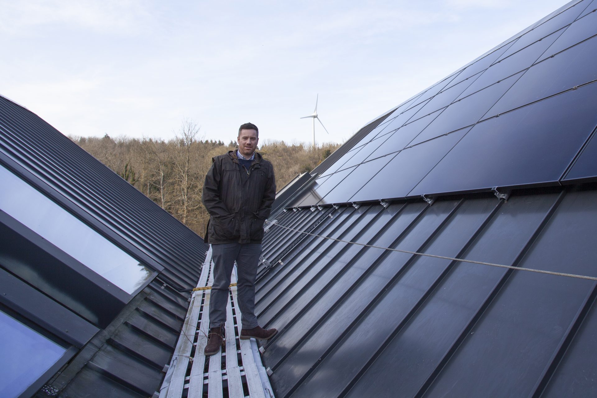Danny Harratt, Glyndebourne’s Head of Facilities, on the roof of the Production Hub reviewing the newly-installed solar panels, January 2025. Photo: Vicky Skeet.