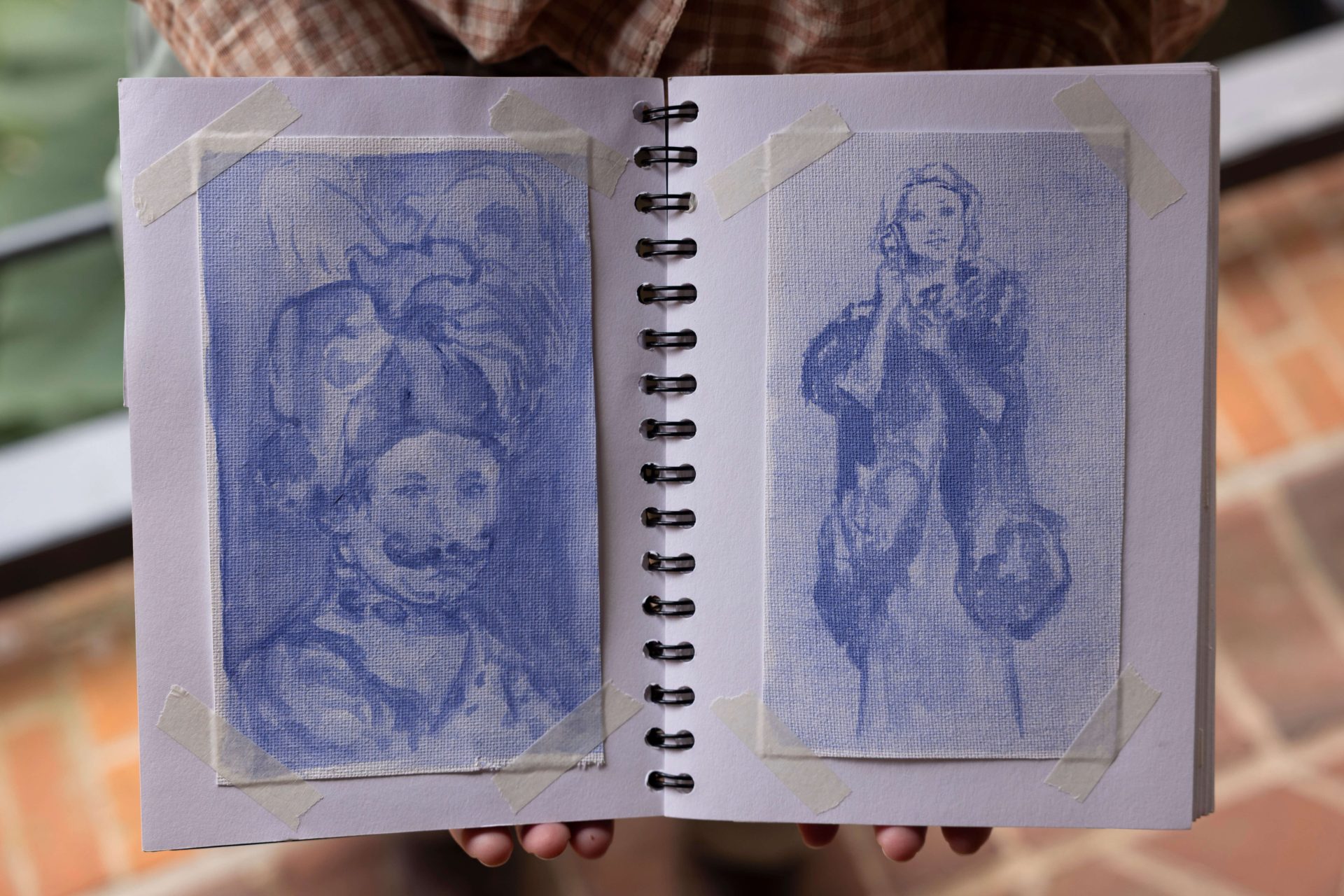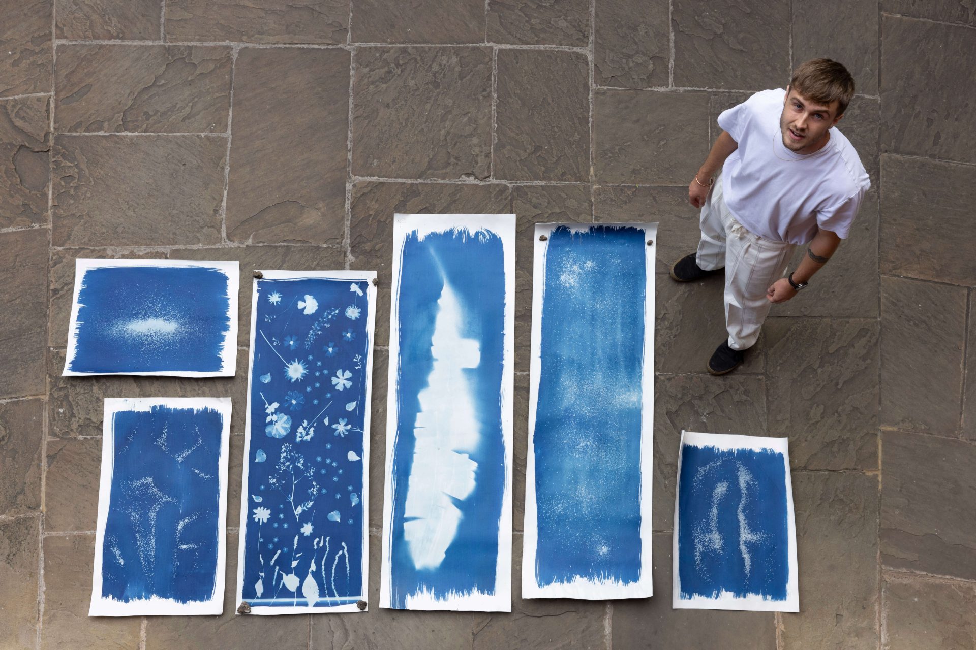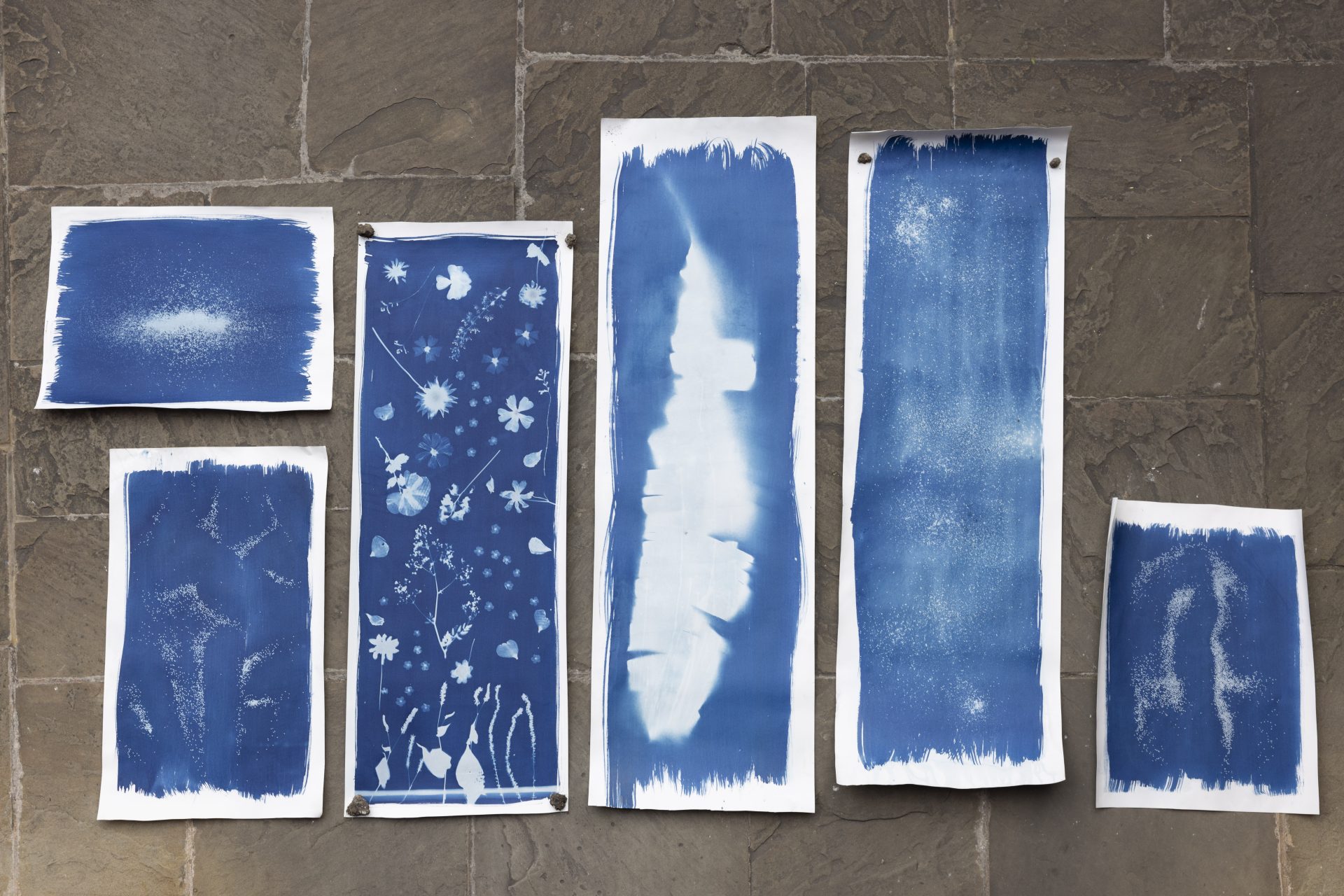 From top left: Pressed in blue No.1 – Cyanotype, Pressed flowers (144cm x 53cm) | Love in a mist No.1 – Cyanotype, Poppy seeds, Nigella damascena seeds (165cm x 53cm) | Pressed in blue – No.2 – Cyanotype, Banana leaf ( 168cm x 53cm) | Love in a mist – No.2 – Cyanotype, Poppy seeds, Nigella damascena seeds (70cm x 53cm) | Love in a mist No.3 – Cyanotype, Poppy seeds, Nigella damascena seeds (72cm x 53cm) | Love in a mist No.4 – Cyanotype, Poppy seeds, Nigella damascena seeds (89cm x 53cm)