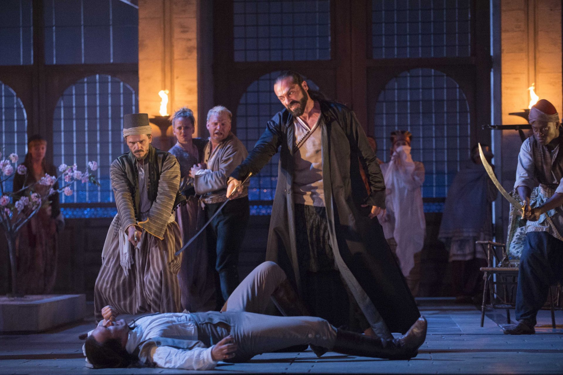 Late at night outside the palace, Belmonte’s Dutch sea captain Klaas helps with the ladders for the escape. As he waits for the appointed hour, Belmonte thinks of Konstanze with rapture. Pedrillo gives the signal with a serenade. Konstanze descends from her window and she and Belmonte make for the harbour but when Pedrillo tries to rescue Blonde, Osmin suddenly appears and they are discovered. Guards drag Belmonte and Konstanze before him and Osmin gloats in bloodthirsty triumph.