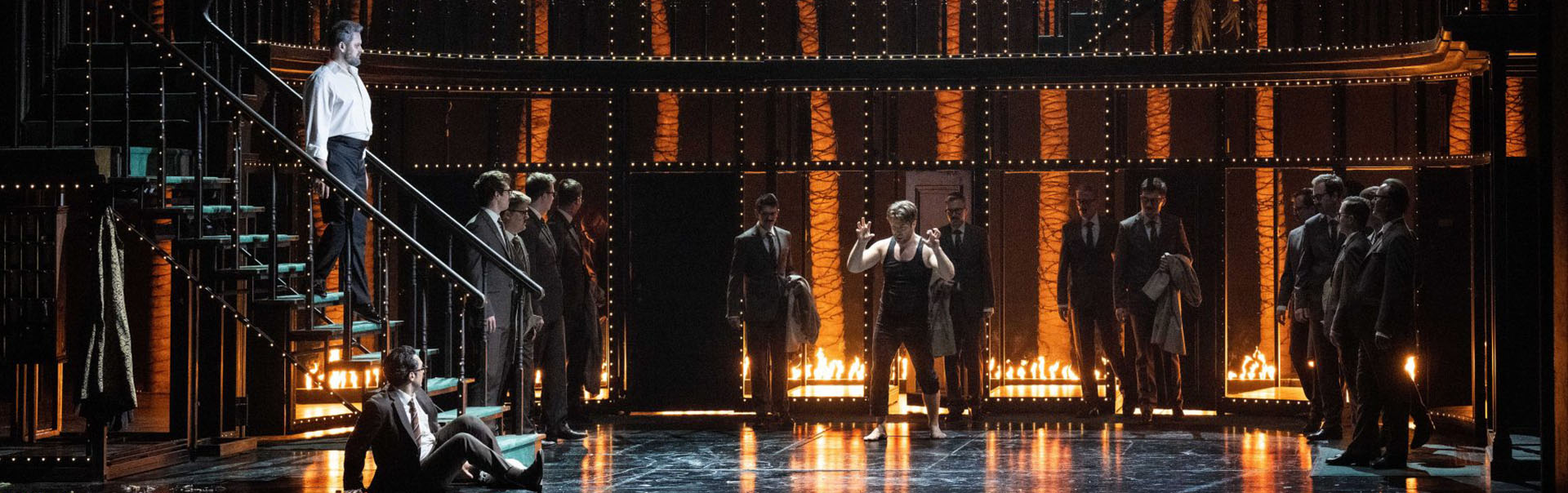 Unaware that his secret has been exposed, Giovanni heads back to his house where all the wedding guests have been invited to feast and celebrate. Concealed behind masks, Elvira, Anna and Ottavio also arrive at the party, hoping finally to unmask Giovanni as the murderer. Giovanni assaults Zerlina, but when she cries out he blames Leporello. The masked avengers confront him and accuse him. Yet, just as it seems as if there’s no escape, Giovanni slips the net and gets away once again.