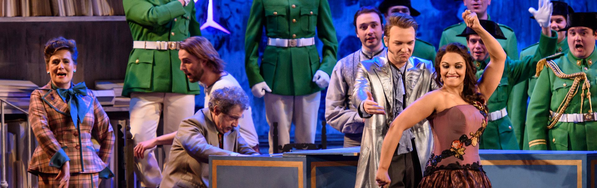 The Count enters in the guise of a drunken soldier, demands lodging, and stealthily passes a note to Rosina. Bartolo claims exemption from quartering soldiers. Figaro appears, reporting that all of the hubbub has drawn a crowd outside the house. The police arrive to arrest the rowdy ‘soldier,’ but the disguised Count secretly reveals his true identity to their captain and is immediately released. Everyone – except Figaro – is flabbergasted by the events.