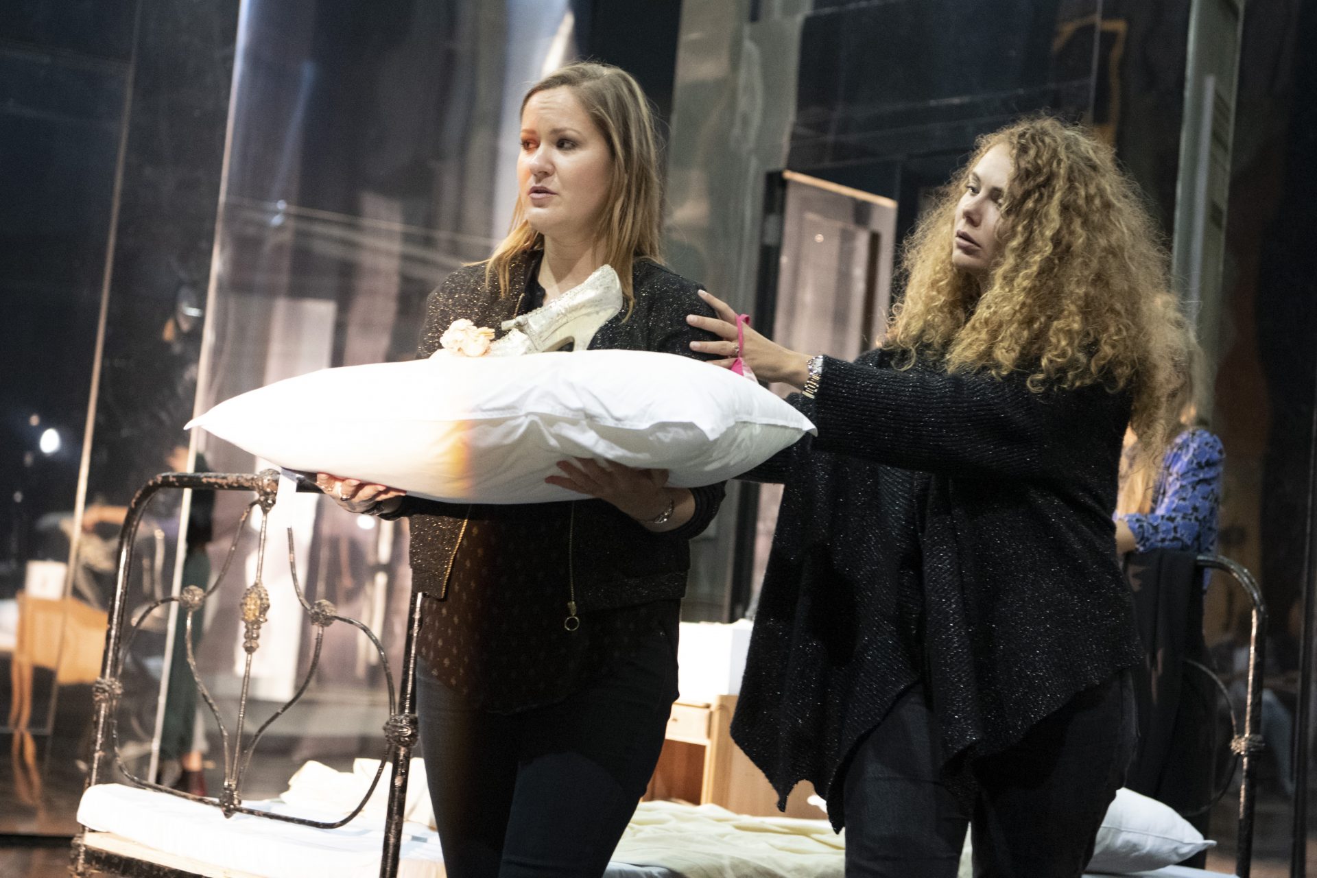 We also have lighting rigged in the room and our lighting director, Anna Watson begins to create atmosphere and works with the four huge mirrors that make up part of our set. Lighting mirrors and watching reflections holds exciting and challenging possibilities.