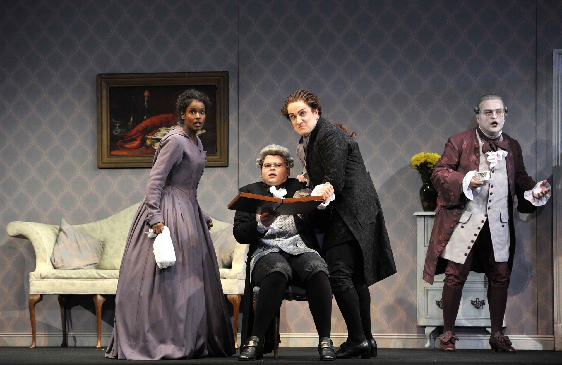Norina (Mariam Battistelli), Notary (Tom Mole), Malatesta (Konstantin Suchkov) and Don Pasquale (Ricardo Seguel)