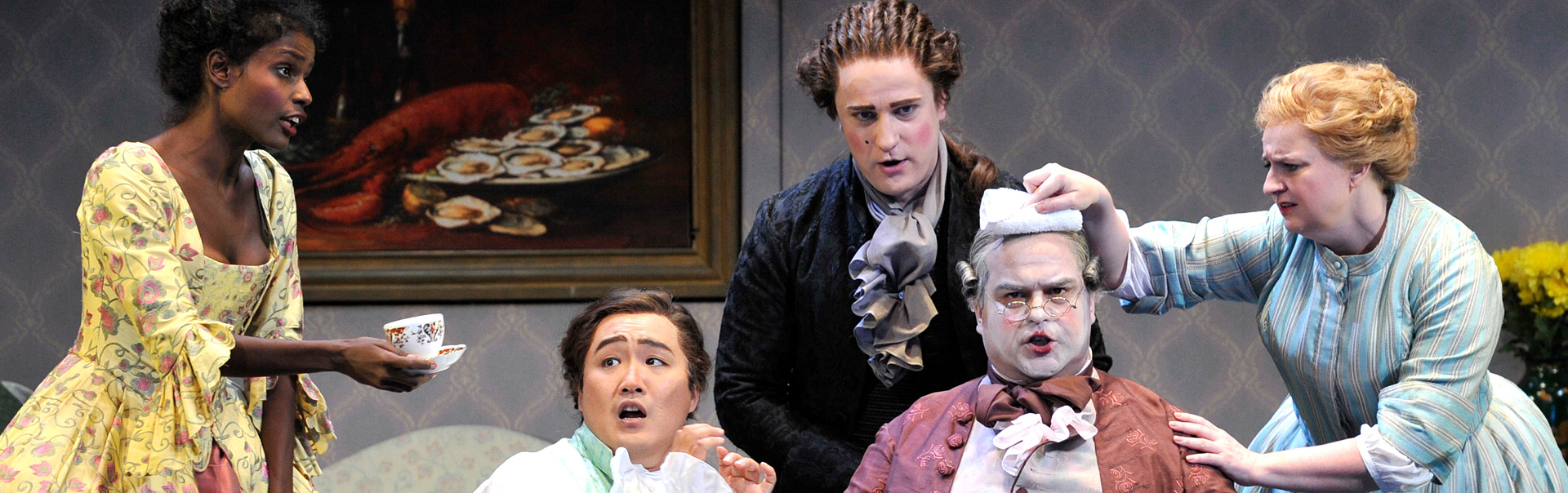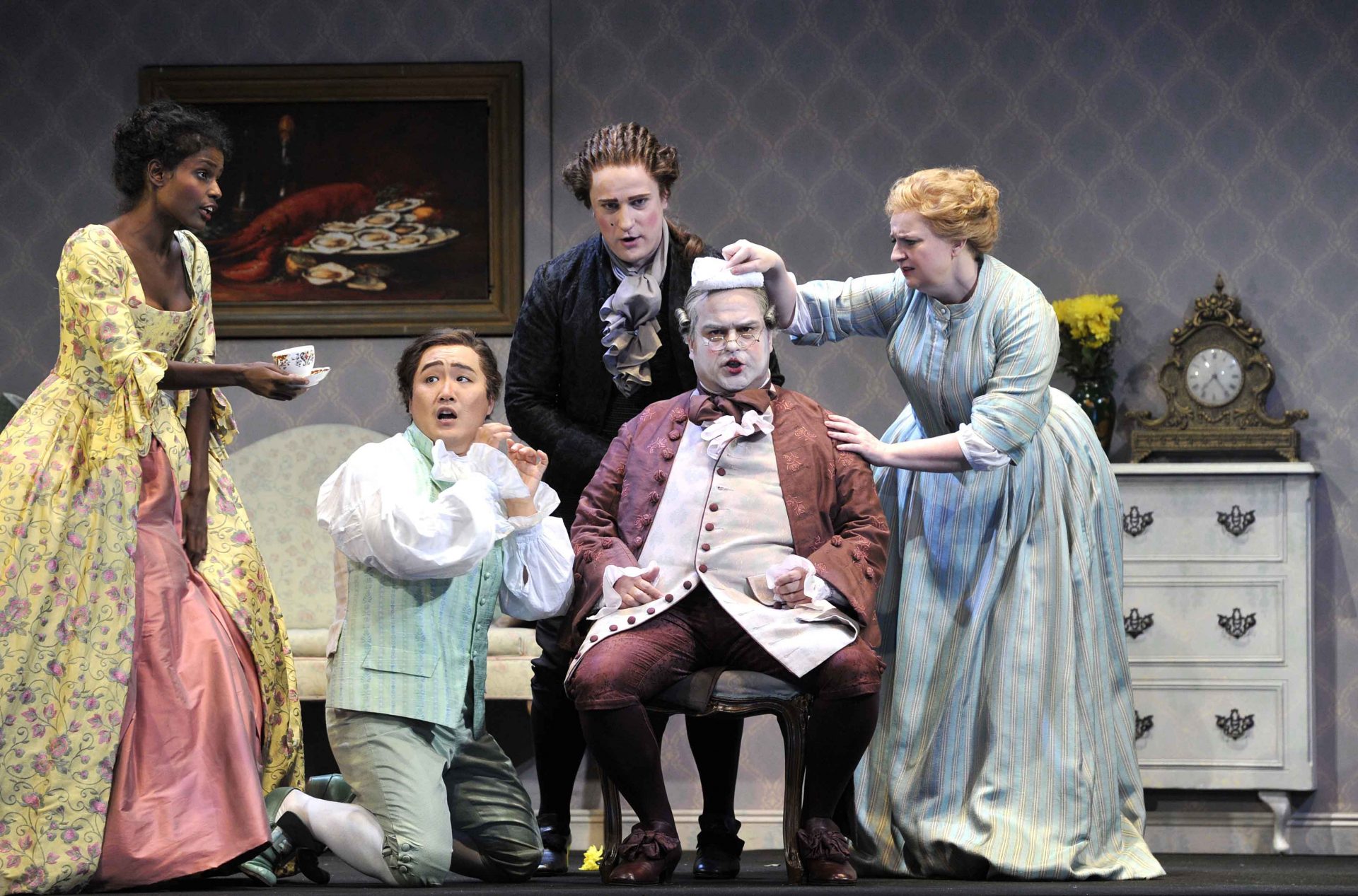 Norina (Mariam Battistelli), Ernesto (Konu Kim), Malatesta (Konstantin Suchkov), Don Pasquale (Ricardo Seguel) and Servant (Anna-Marie Sullivan)
