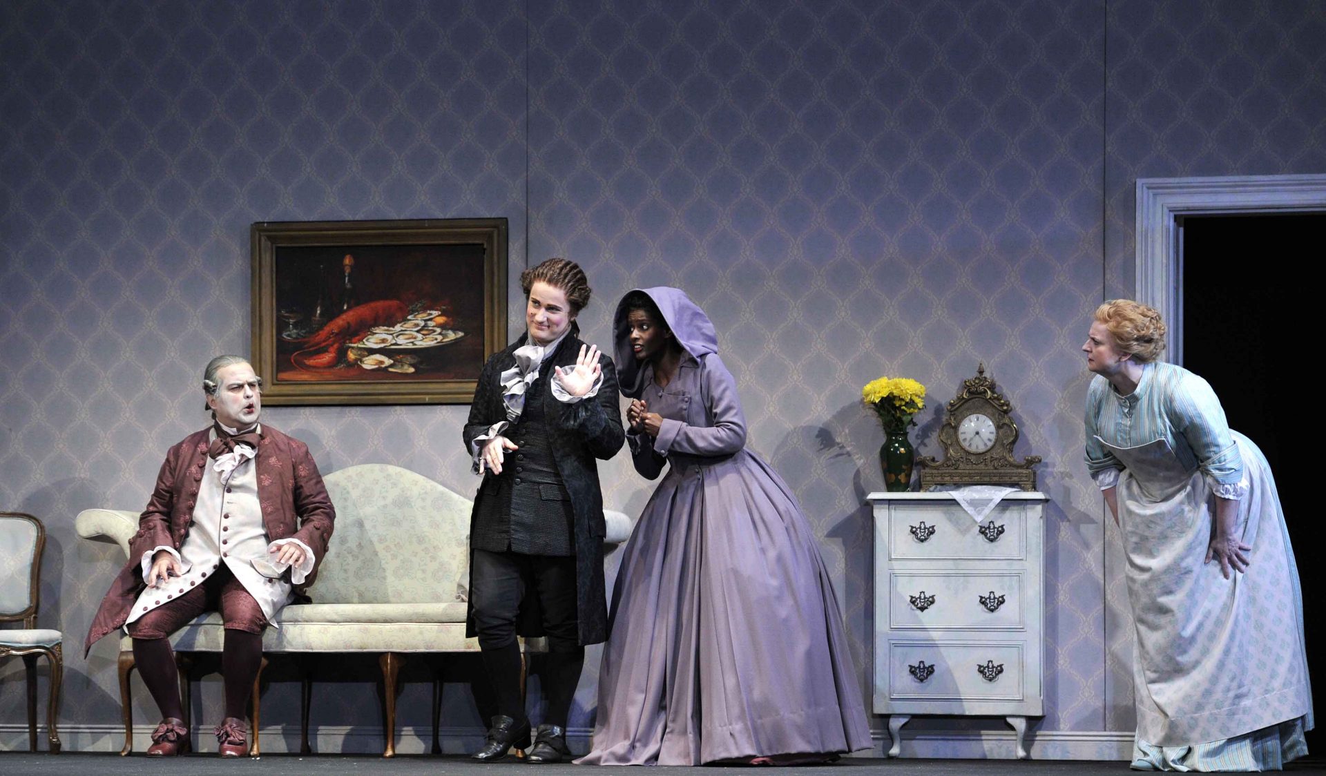 Don Pasquale (Ricardo Seguel), Malatesta (Konstantin Suchkov), Norina (Mariam Battistelli) and Servant (Anna-Marie Sullivan)