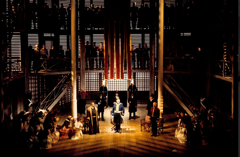 Verdi’s Otello came to the Glyndebourne stage for the first time in 2001 in a Peter Hall production. The role of Desdemona was sung by the incomparable soprano Susan Chilcott, who tragically passed away just two years later. The image below shows Peter Hall and Susan Chilcott in rehearsals: