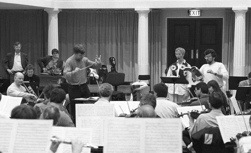 Rehearsals for the 1993 concert version of Béatrice et Bénédict, with Andrew Davies conducting. Photo: Guy Gravett