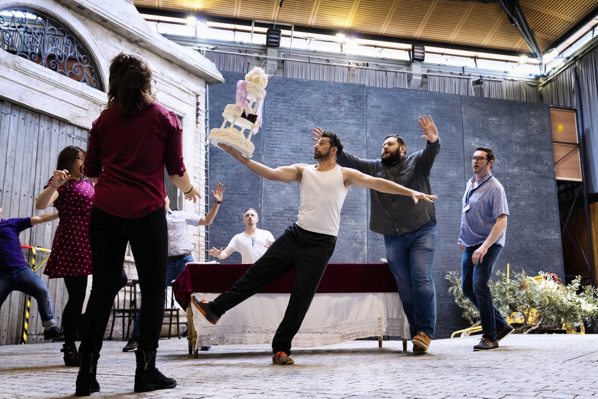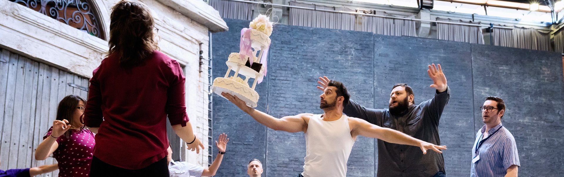 Carrie-Ann Williams (Giannetta), Benedetta Torre (Adina), Maxime Nourissat (Dr Dulcamara’s Assistant), Misha Kiria (Dr Dulcamara), Matthew Durkan (Belcore) and actors (Jofre Caraben van der Meer, Andrew Hayler, Anthony Kurt Gabel)