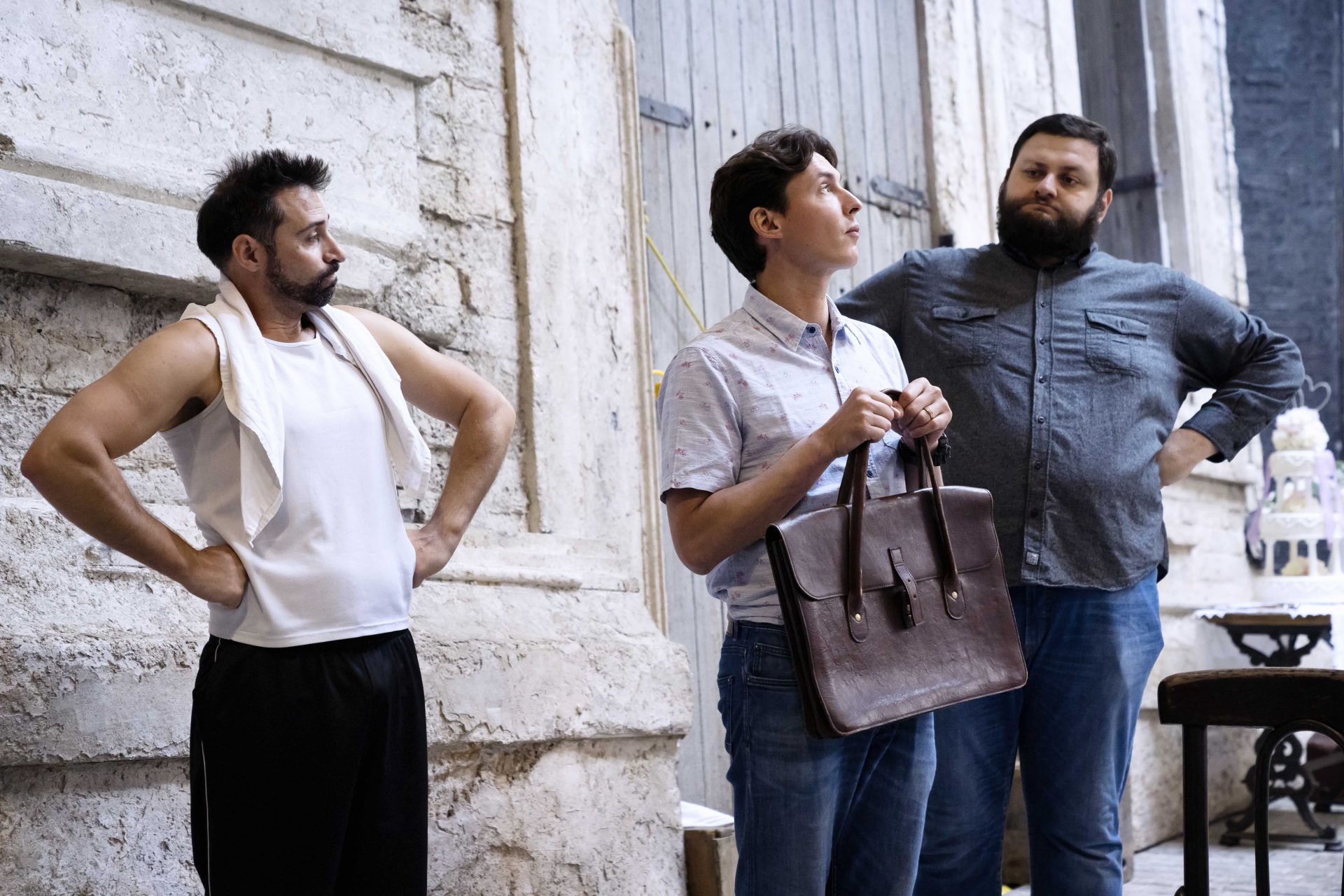Revival Movement Director Colm Seery with Misha Kiria (Dr Dulcamara) and Benedetta Torre (Adina)