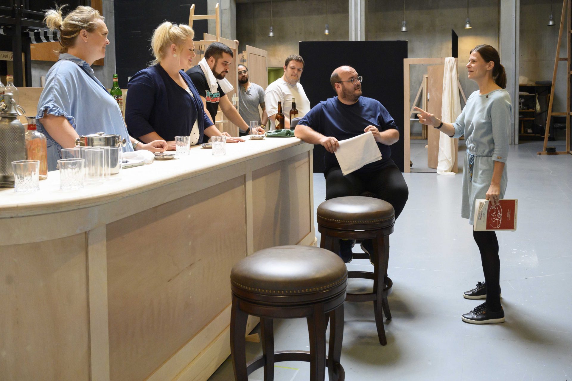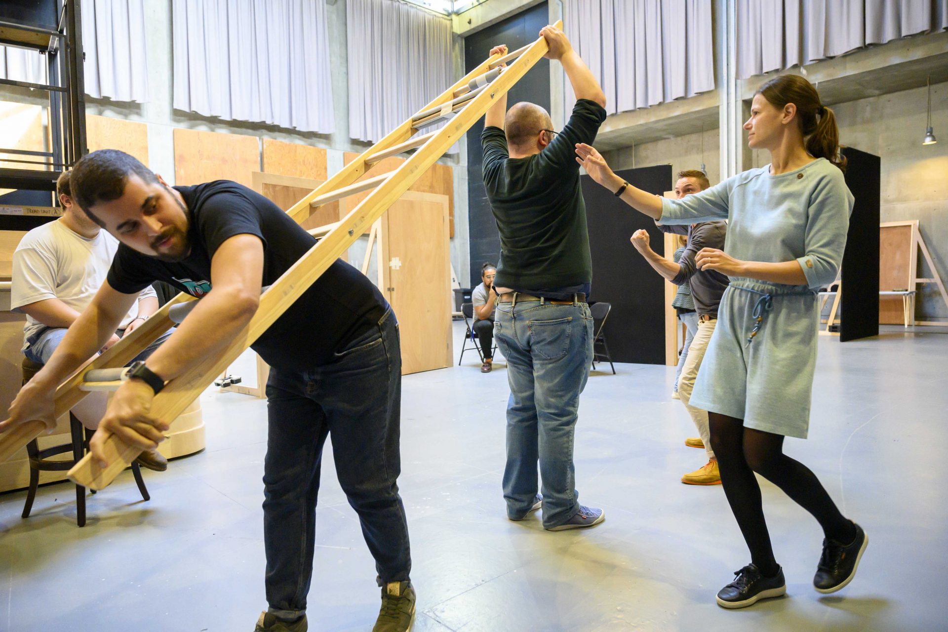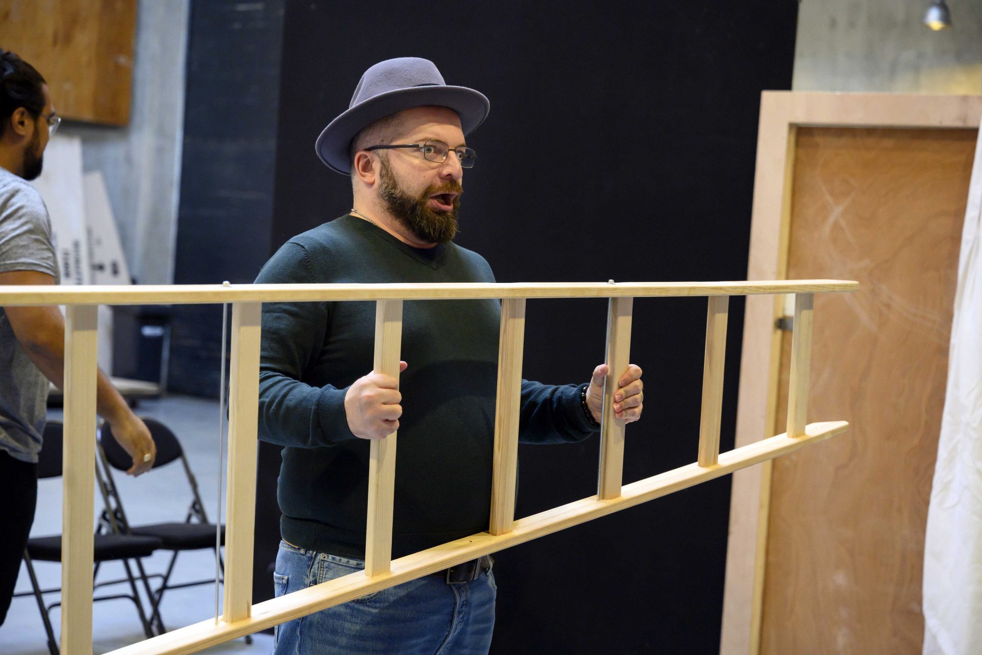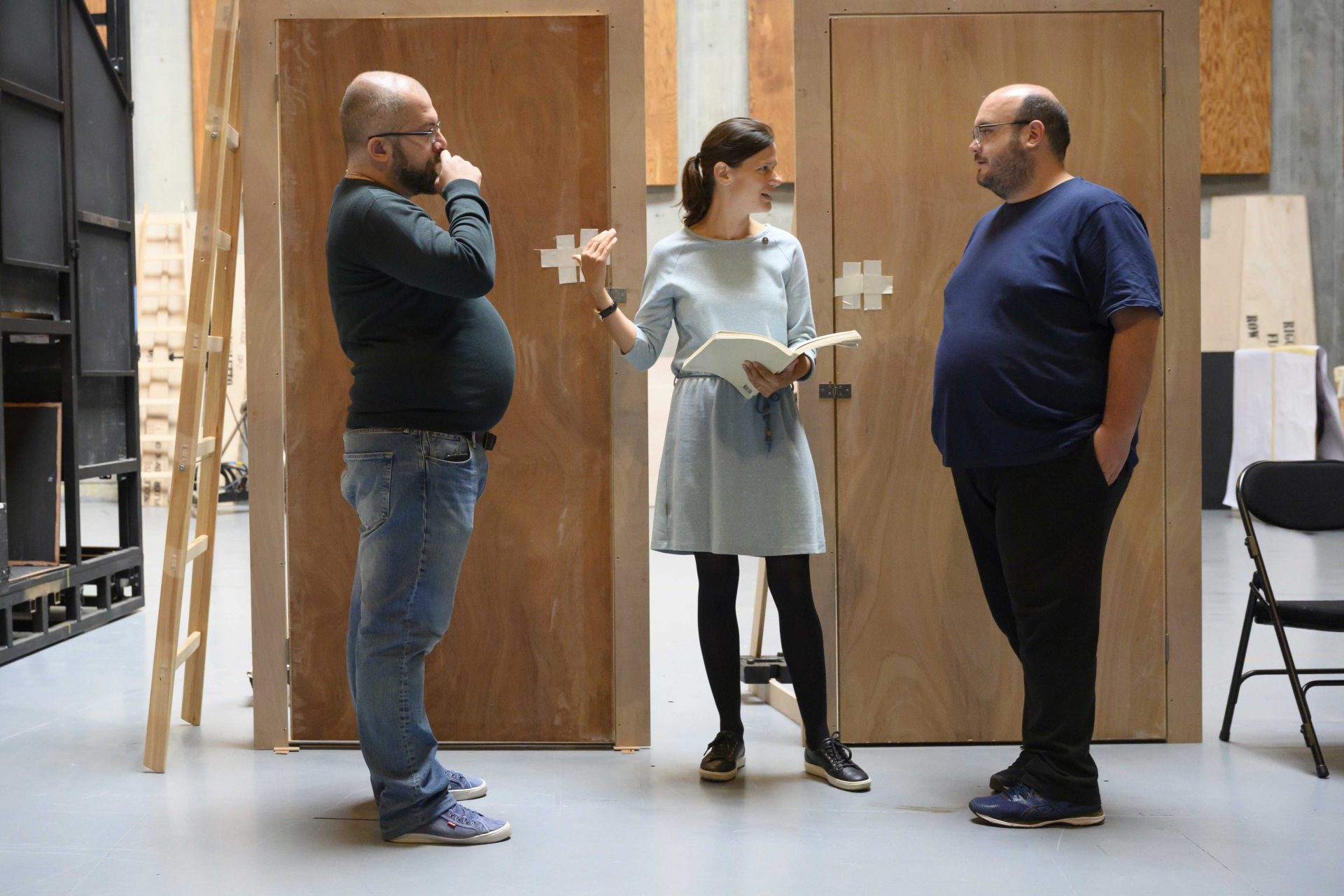 Oleg Budaratskiy (Sparafucile), Nikoloz Lagvilava (Rigoletto) and director Christiane Lutz