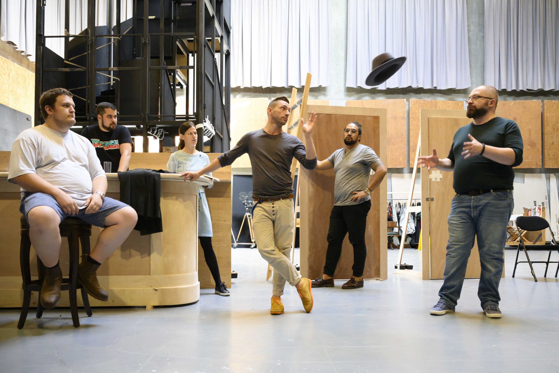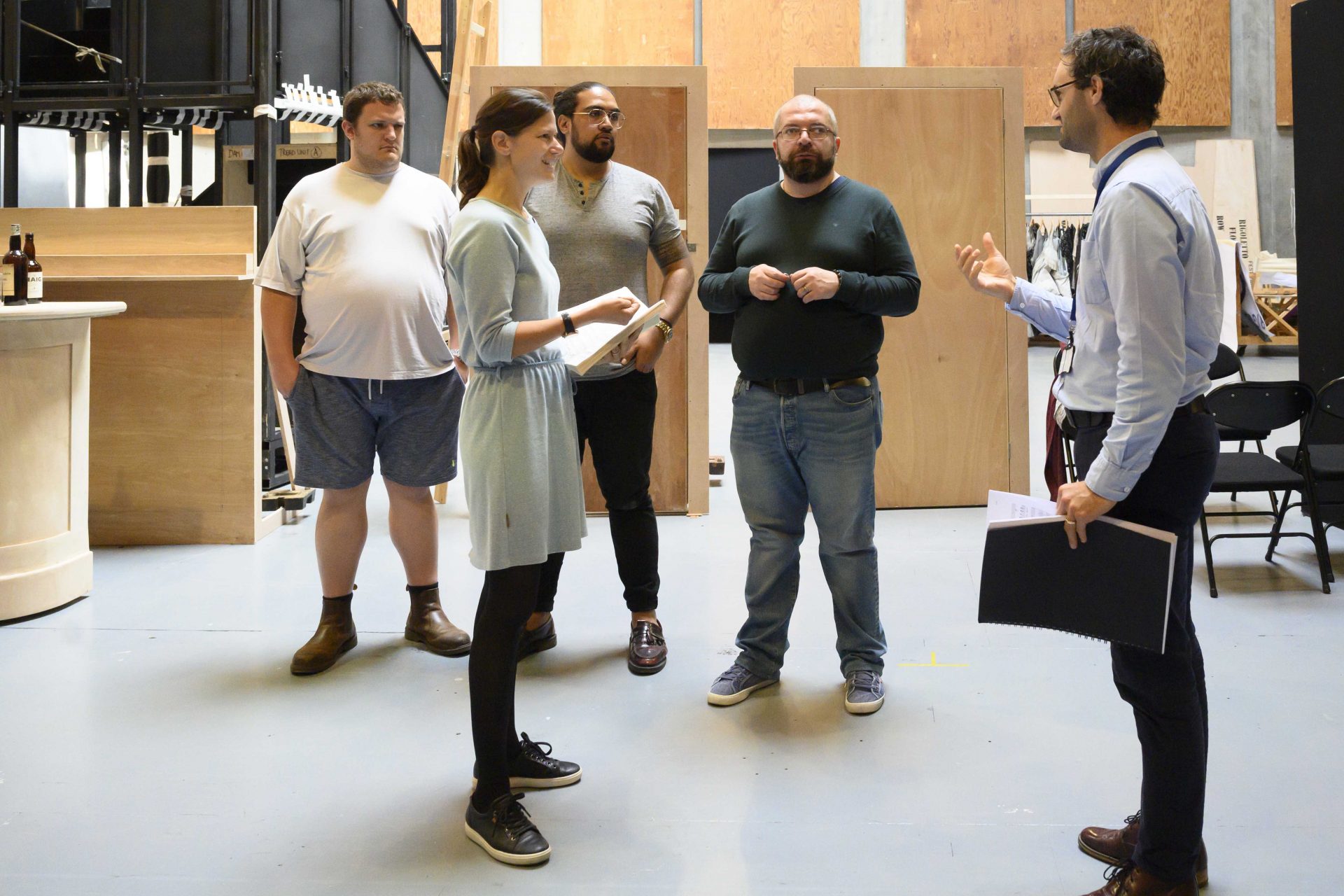 John Findon (Matteo Borsa), Oleg Budaratskiy (Sparafucile), director Christiane Lutz, movement director Volker Michl, Benson Wilson (Marullo) and Nikoloz Lagvilava (Rigoletto)