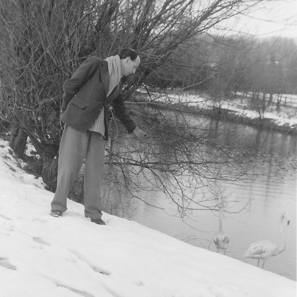 Above: Rudolf Bing at Glyndebourne in 1941 by the lake, and visiting the flamingos from London Zoo that made Glyndebourne their home during the war.